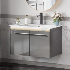 AMERLIFE 31″ LED Floating Bathroom Vanity with Sink, High Gloss Single Sink Wall Mounted Bathroom Storage Vanity Cabinet, Modern Bathroom Sink Cabinet with Metal Handles, Gray ***PLEASE SEE DESCRIPTION***