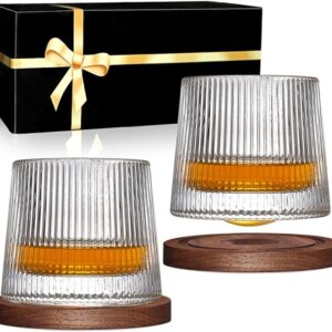 Whiskey Glasses Set of 2, Rotatable Tumbler Crystal Glass Cups Walnut Coasters