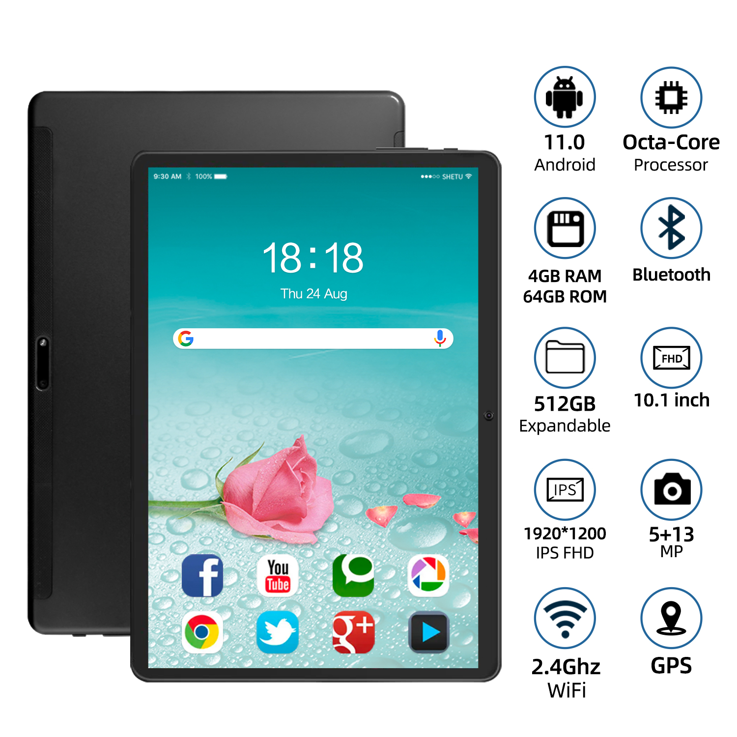 10.1 inch Tablet Android 11 Tablets PC 64GB Storage Octa-Core Processer, IPS Full HD Display – Black