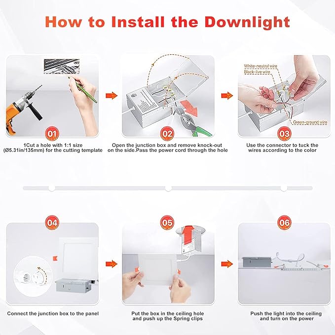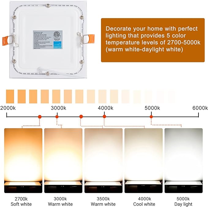 - 5 CCT Square LED Downlight:2700k, 3000K, 3500k, 4000K, 5000K, 5 color temperatures adjustable with a simple junction box, which can custom color temperature lighting, eliminating the trouble of color temperature selection.
