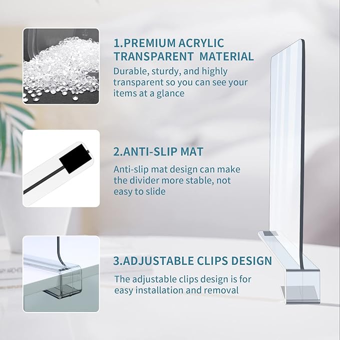 - 👍Upgraded Quality & Durability: These shelf dividers in closet are made of selected high quality acrylic material with advanced processing for better ductility and durability, will not deform, and are stronger, clearer, lighter and safer than glass, wood or chrome dividers. In addition, the bottom of the closet divider has an anti-slip mat that won\’t scratch your shelves when sliding. Our acrylic dividers will prove to be long lasting and are a great way to increase available storage space.