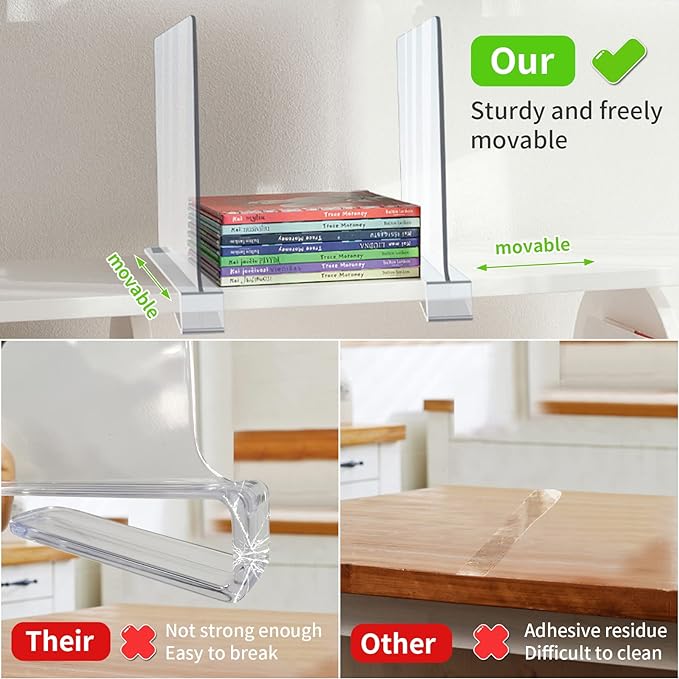 - 👍Multifunctional Organization Solution: The acrylic shelf dividers are great for organizing things. They can help you to separate large shelves into functional areas. Stack clothes, jeans, handbags, towels, blankets, bed linen, books, spice jars and other items neatly, keeping items upright to maximise storage space. Not just for your wardrobe, shelf dividers are also perfect for your kitchen, pantry, bedroom, office, living space. Make your home neater and cleaner. Ideal closet shelf organizer!