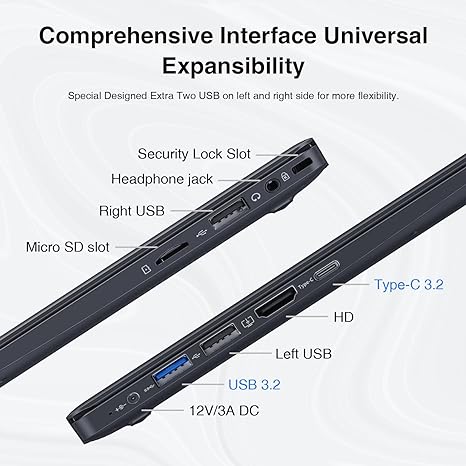 - Full-Functional Type C and Standard Size HD – The laptop comes with a full-functional Type C port for charging or data transfer and a normal HD 1.4 port for an external screen or projection. Additionally, there is 1xUSB3.2, 1xUSB2.0, 1×3.5mm Headphone Jack, and 1xTF Card slot.