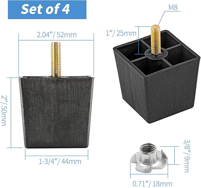 - *Products Detail – 4 x Square Furniture Legs, 4 x M8 T-Nut. Furniture legs height is 2″ / 50mm, M8 screw bolts length is 1″ / 25mm, top width is 2.04″ / 52mm, bottom width is 1-3/4″ / 44mm. The load capacity of each foot is 100kg / 220lbs, and the total load capacity is 400kg / 880lbs.