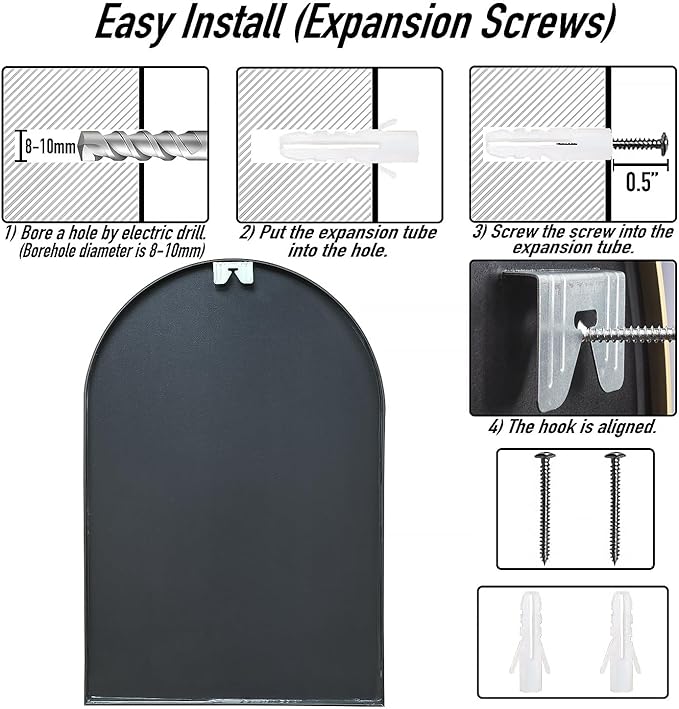 • Easy to install: Install the expansion screws (contained in the package) into two drilled holes, and then hang the mirror on the screws.