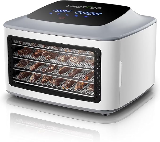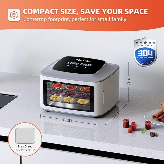 - ✅【EASY TO CLEAN METAL INTERIOR】Four stainless steel shelves with adequate space between their placement, clean up easily stainless steel interior. Just soak for a little while and like magic it’s ready to do more dehydrating.
