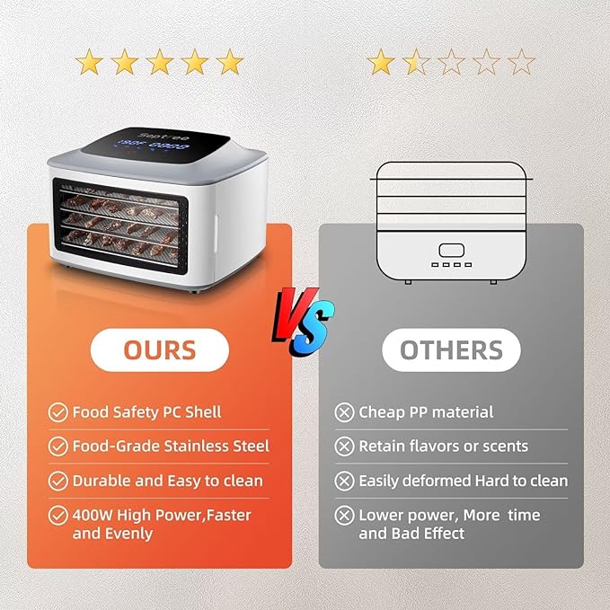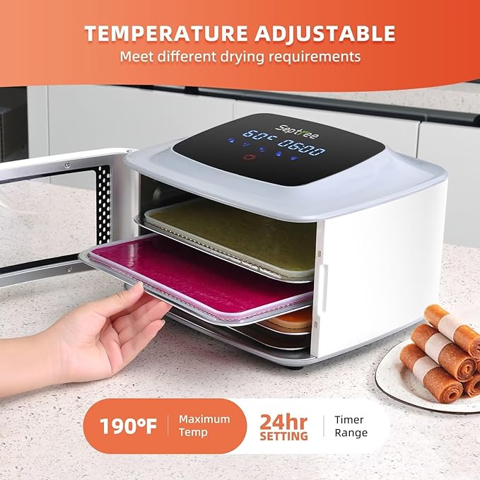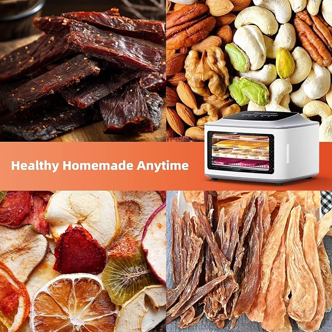 - ✅【EASY TO USE DIGITAL DISPLAY】The touch menu on top of our food dehydrator is easy to read and controls are simple to adjust the time and temperature ( Excellent temperature range from 70º F to 190º F), it can even remembers previous settings so it is a one-touch to start another batch.