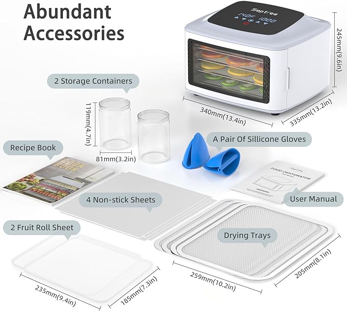 - ✅【GREAT VALUE FOR BEGINNER】This food dehydrator machine Holds 4 layers, which is enough for drying small batches, 4 silicone mats, 2 non-stick Trays, 2 containers and 2 set of silicone glove. Also comes with details for a variety of foods, and thanks to the flexibility to tweak drying times depending on personal preference. It’s fun to experiment. Any fruits, veggies, herbs, etc.