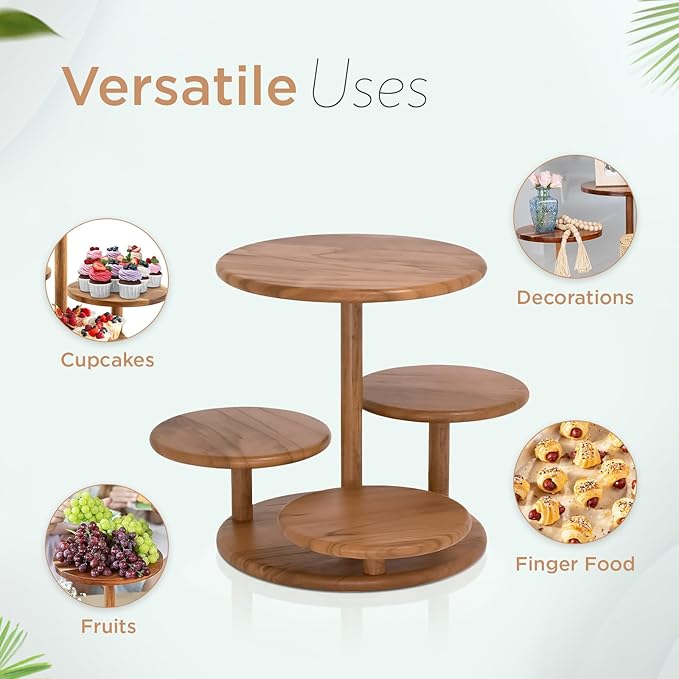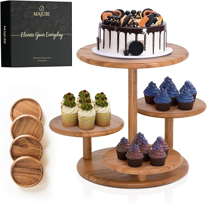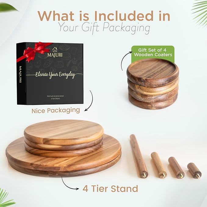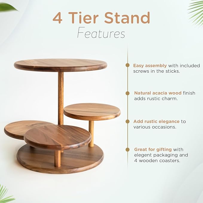 - UNLEASH YOUR CREATIVITY, WOW YOUR GUESTS – Let your imagination run wild with our tiered dessert stand! With each purchase, receive a fabulous gift set with beautiful packaging and 4 wooden coasters Elevate dessert presentation and impress guests with our 4 tier dessert stand and exclusive gift set!