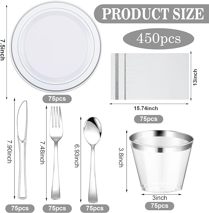 450 Pcs Plastic Dinnerware Set Disposable (Silver)