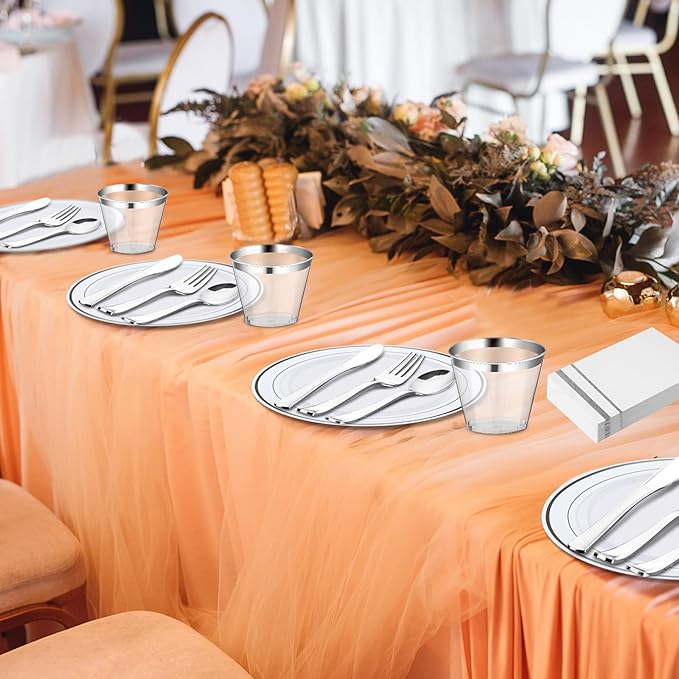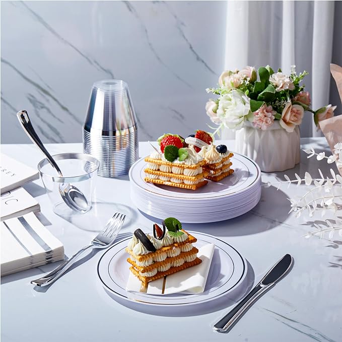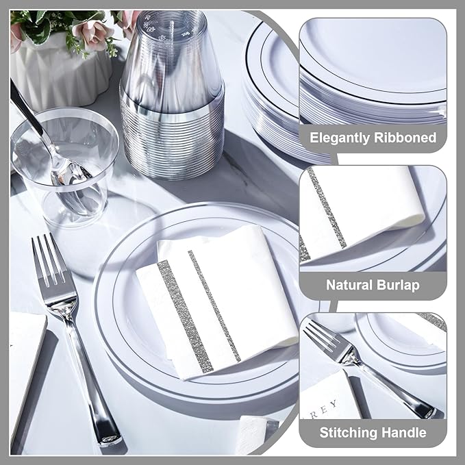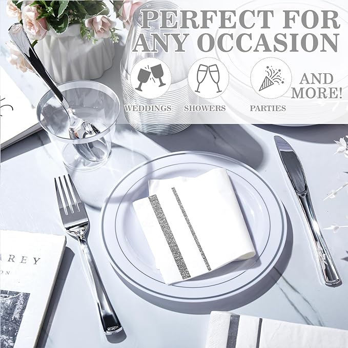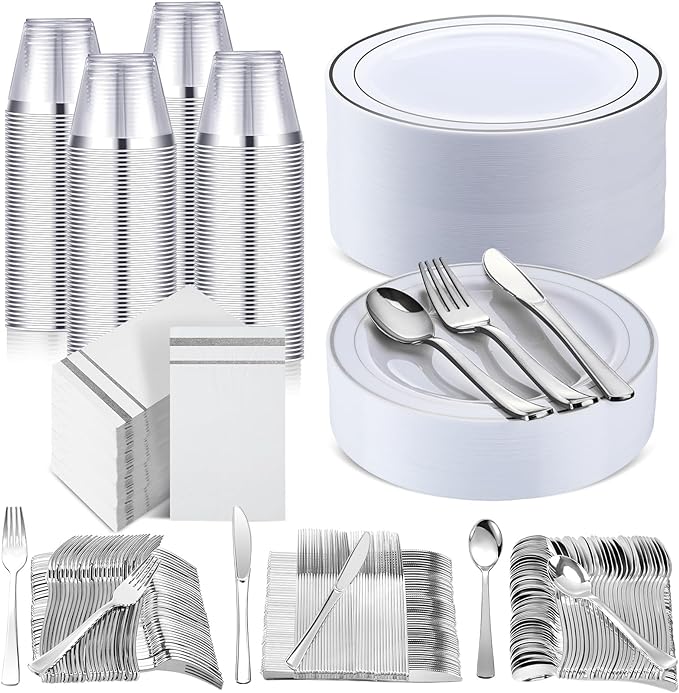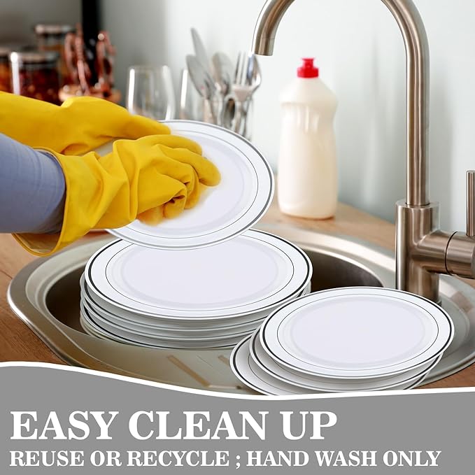 - Elegant Appearance: our plastic dinnerware is handy yet elegant, embellished with silver color, adding charm to your parties and other occasions; The sleek design fits seamlessly into casual and formal aesthetics