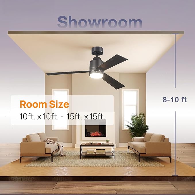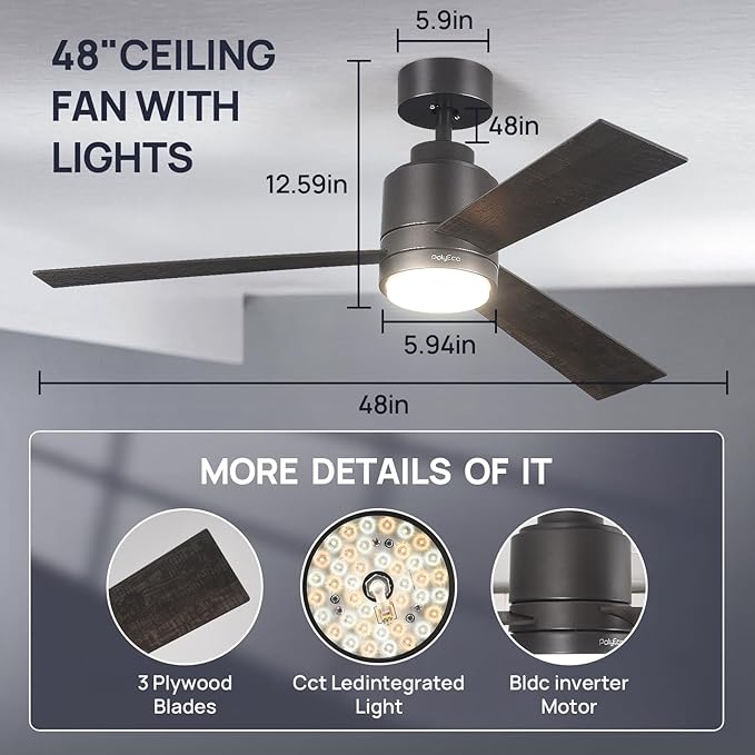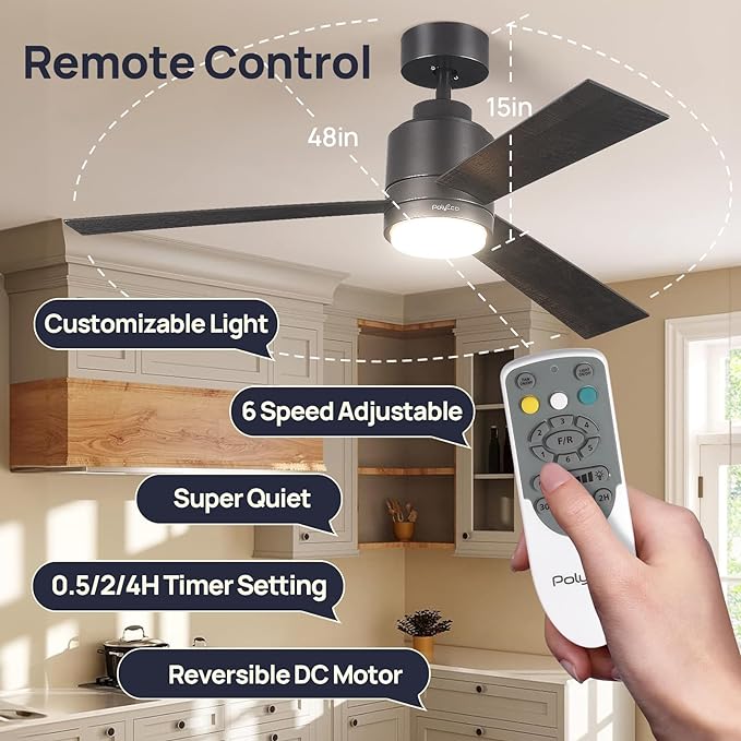- Stylish Design And High Quality Materials: This 48-inch ceiling fan with light features a low profile design and premium materials to suit any style, including living rooms, bedrooms, bathrooms, farmhouses, or patios. Its gloss black body and plywood fan blades add a touch of modern luxury to any space.