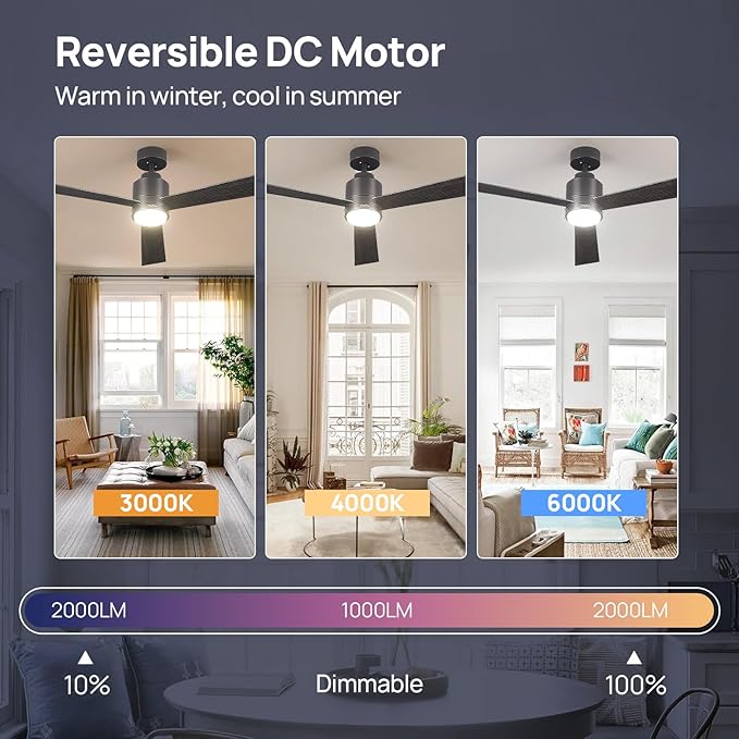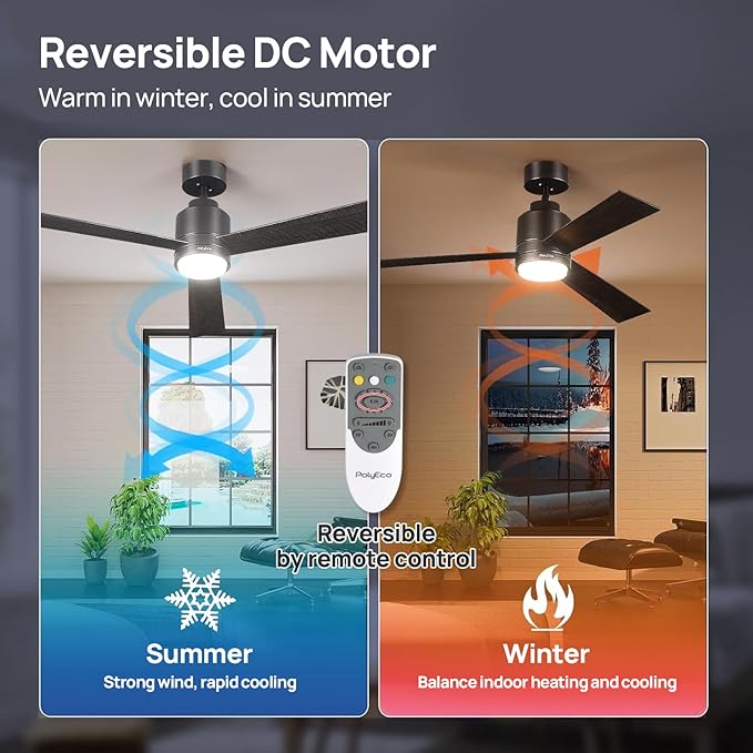 - Reversible Airflow: Featuring reversible DC motor technology that easily changes the direction of airflow from downdraft mode during summer months to updraft mode in winter – providing a wind chill effect in summer while reducing energy consumption costs; In winter simply click on the remote control button for reversed operation which will circulate hot air trapped near ceilings increasing comfort levels while decreasing heating costs.