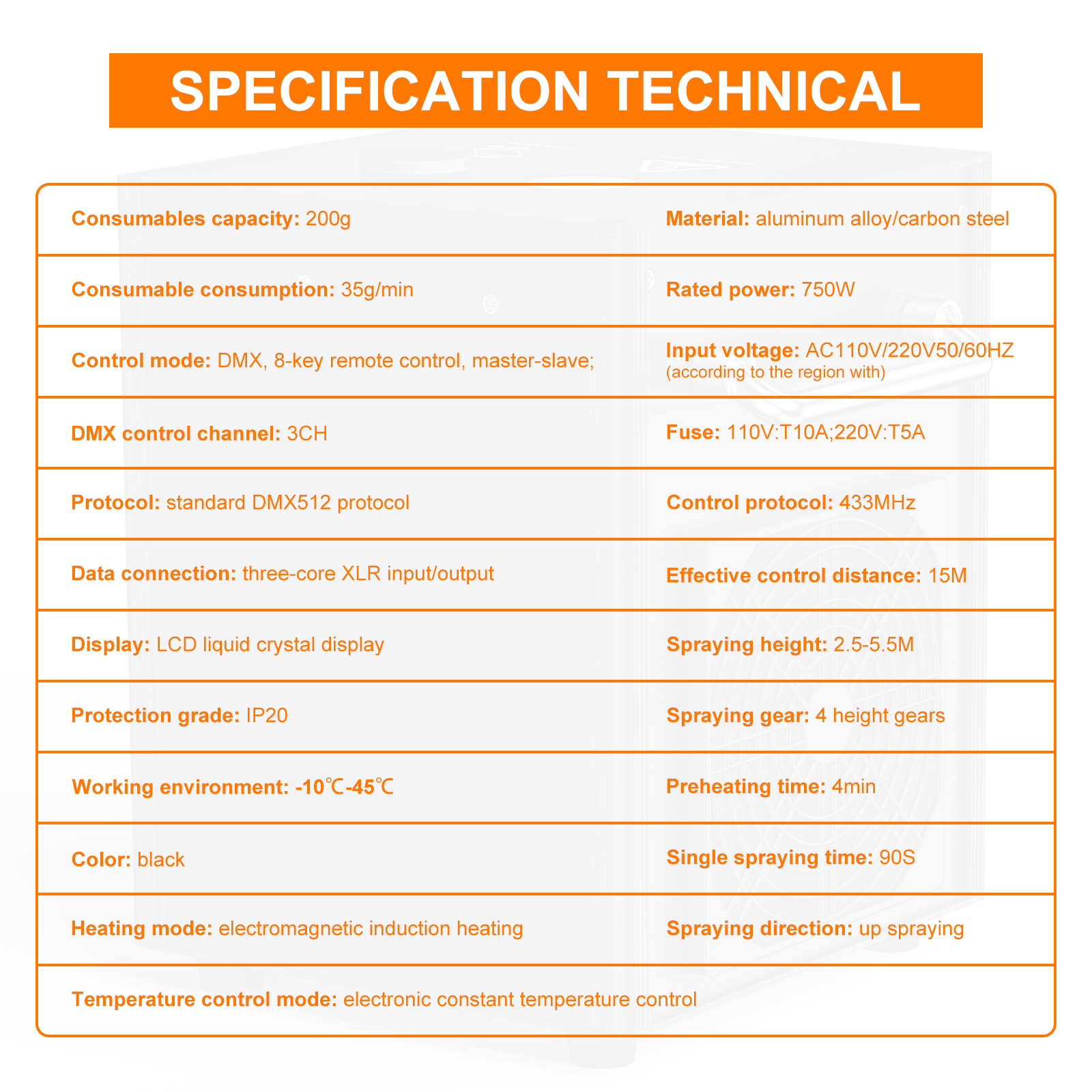 3. Simple operation. Dual-drive consumable delivery system, three control modes (DMX, 8-button remote control, master-slave), more accurate control; LCD control, Chinese and English bilingual switching, more intelligent and easy to use.