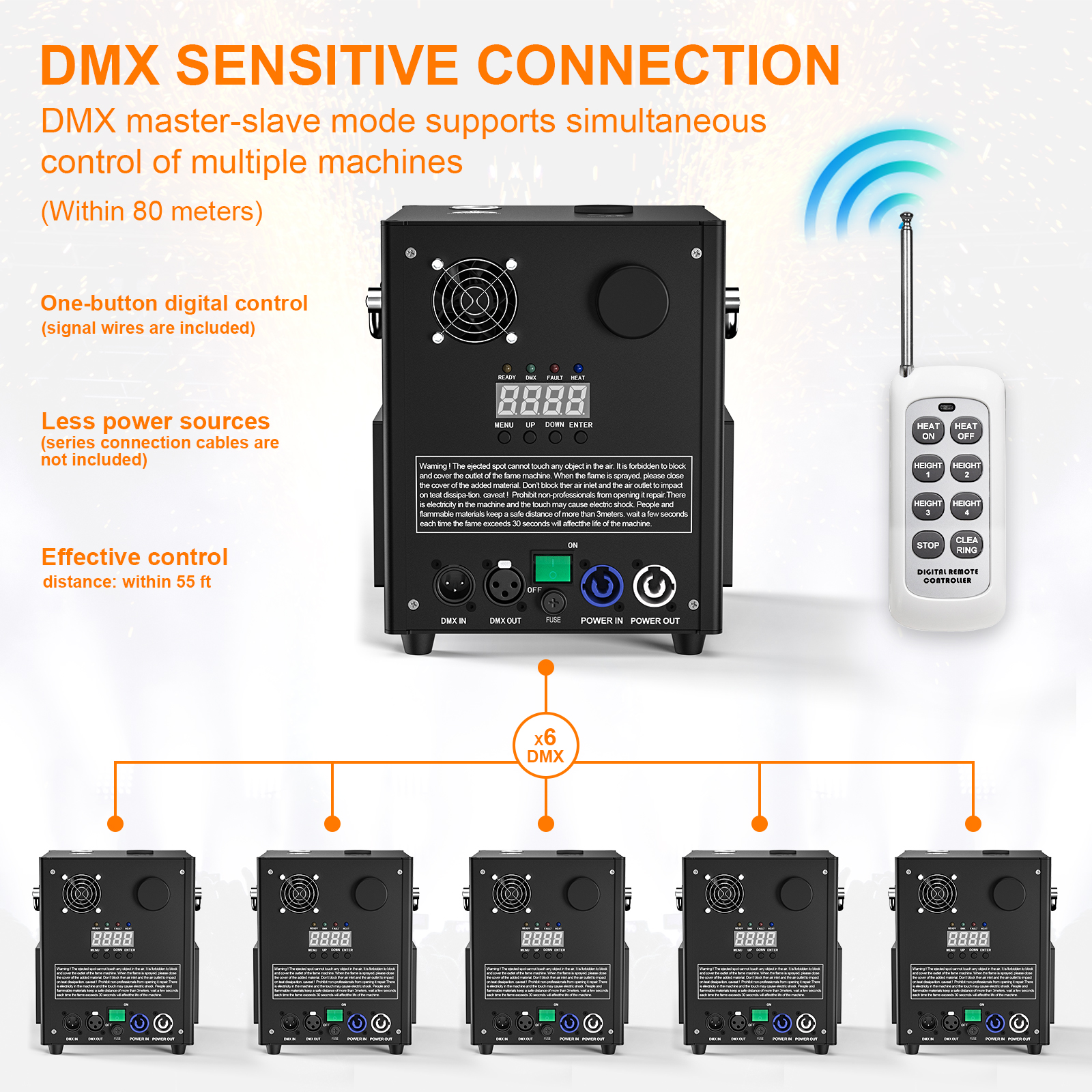 - DMX Multi-connection: Our fireworks machine adopts the advanced DMX controlling system so that it can be multi-connected to satisfy your needs. You can connect no more than 6 machines at the same time with the signal lines. We will offer you 1 signal line and 1 cable in the package for your quick use.