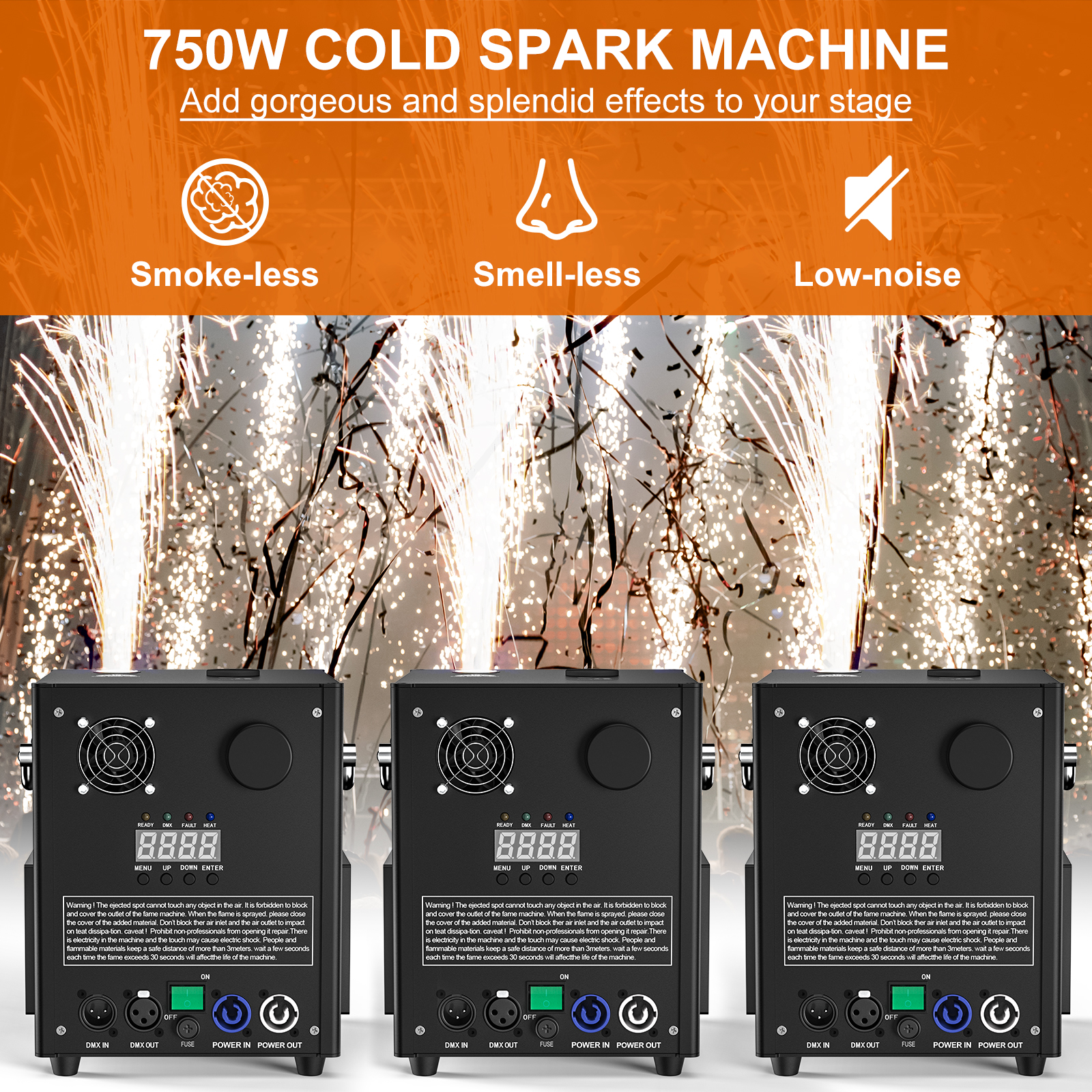 - 3-Gear Modes to Adjust: Spark Direction: Up; Spark height range: 6.6-9.8 ft(2-3 m). This high-quality cold spark machine DMX offers you 3 adjustable flame heights to achieve different lighting effects, creating a splendid romantic atmosphere. Of course, you can effortlessly change the heights with the digital controller.