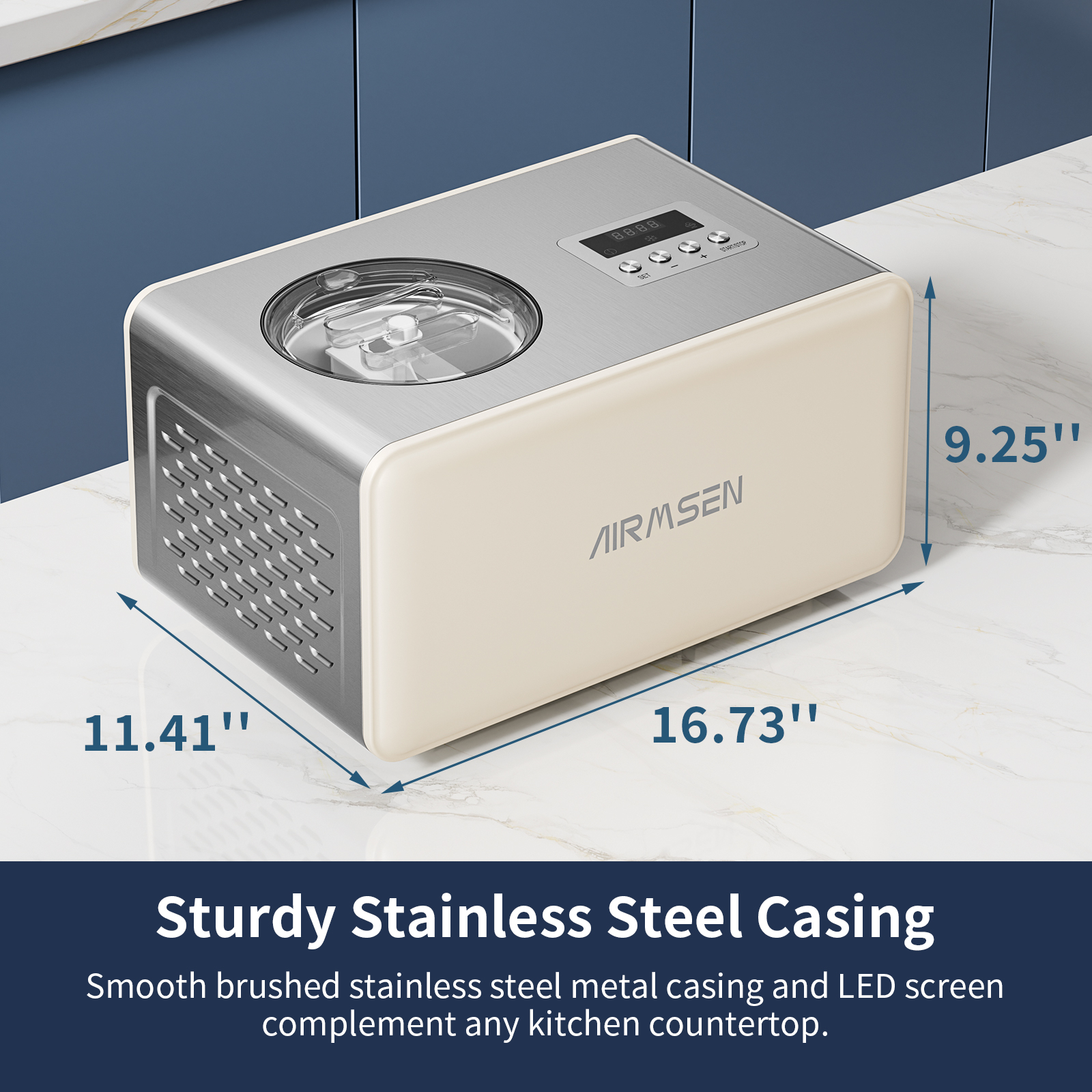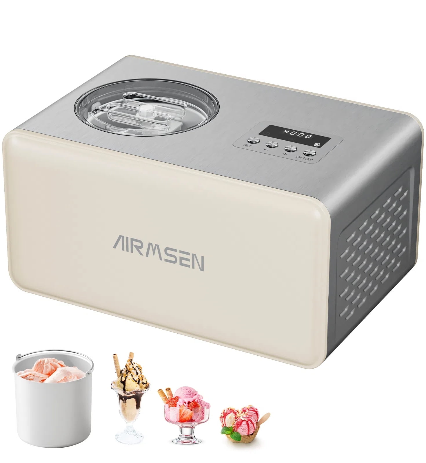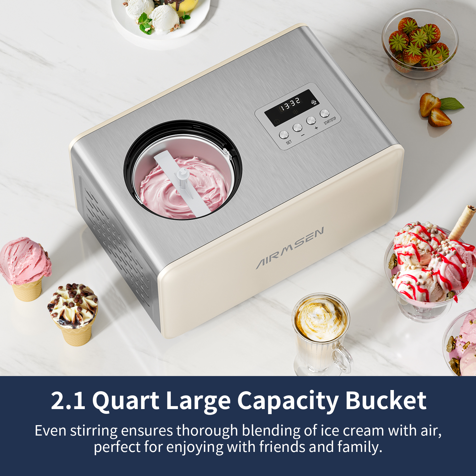 Craving ice cream, milkshakes, or frozen yogurt? Begin crafting your dream desserts today! This AIRMSEN ice cream maker has a stylish and modern look, premium quality, and a 2.1-quart capacity, making it perfect for home use. The design of the built-in compressor eliminates the need for pre-freezing and saves time. An easy-to-use LED screen and timer give you complete control over the process, allowing you adjust the time at any time. The powerful motor and automatic mixing paddle do all the work, delivering your custom frozen treats in just 40 mins. Elevate every occasion with our versatile and stylish ice cream maker? every scoop is a sweet masterpiece!