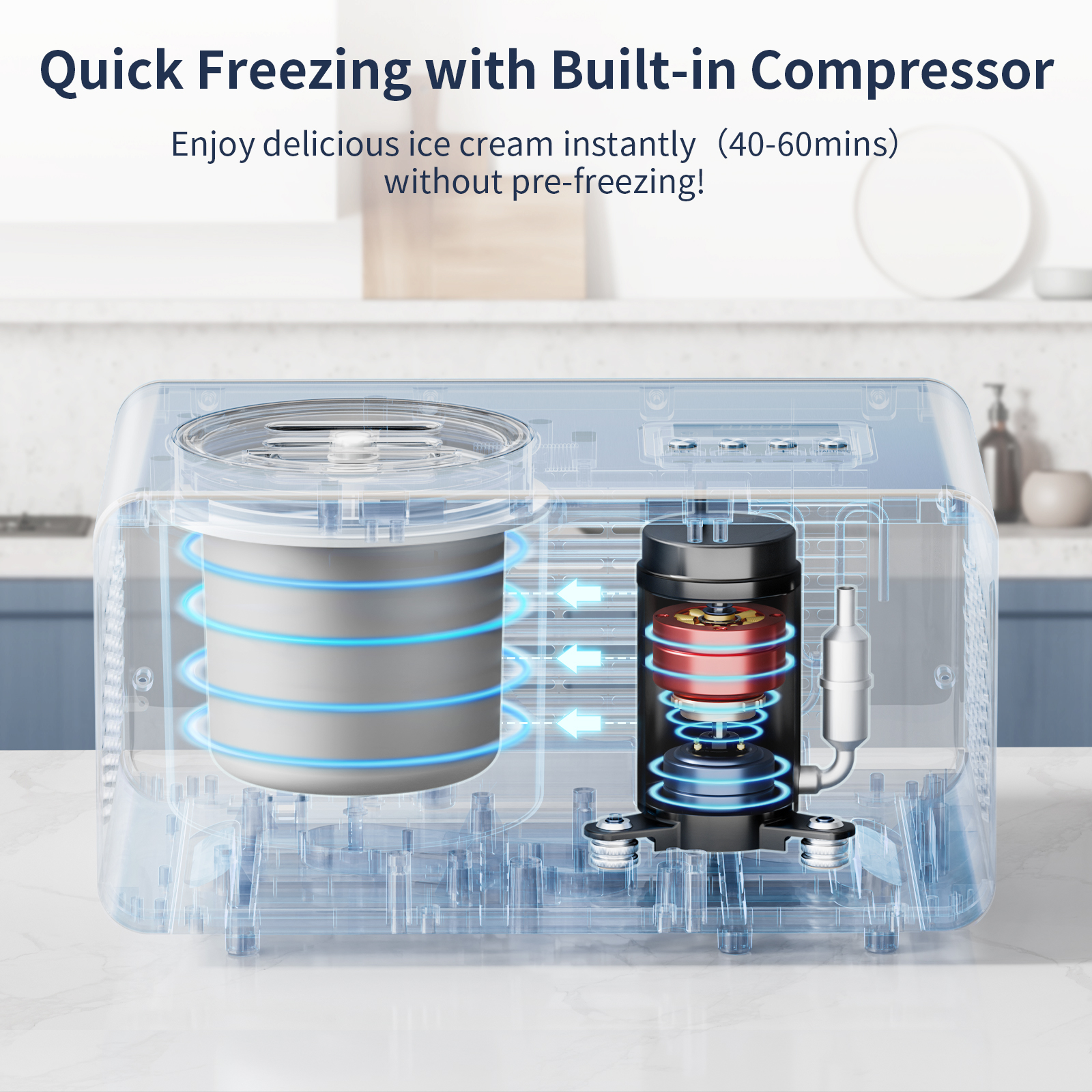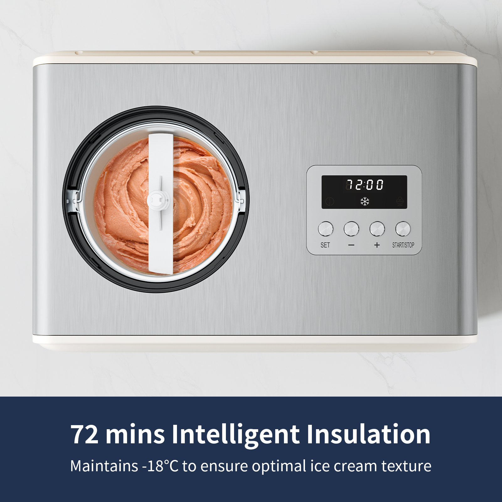 [Freeze Quickly with Built-in Compressor]: Built-in powerful compressor freezer eliminates the need to pre-freeze the mixing bowl, making it easy to make ice cream continuously. The ice cream machine will automatically enter a frozen state after completing the ice cream production and maintain continuous cooling for 72mins, which help keep the ice cream fresh and delicious.