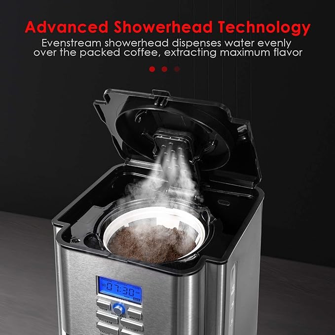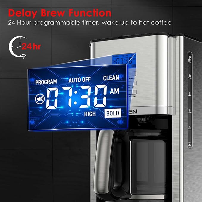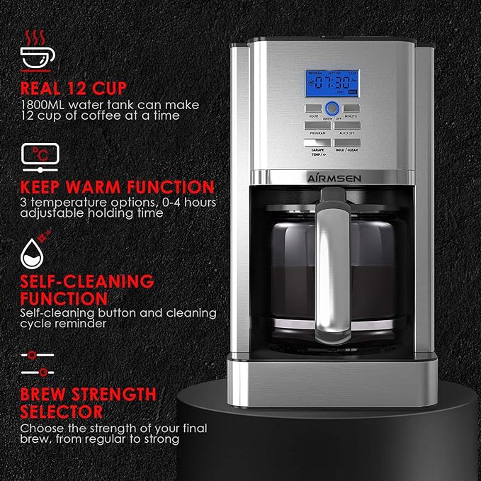 AIRMSEN Drip Coffee Maker 12 Cup, Programmable Coffee Maker 4 Hours Warming Stainless Steel Coffee Machine with Glass Carafe, Reusable Filter for Home and Office – CM1705BATE