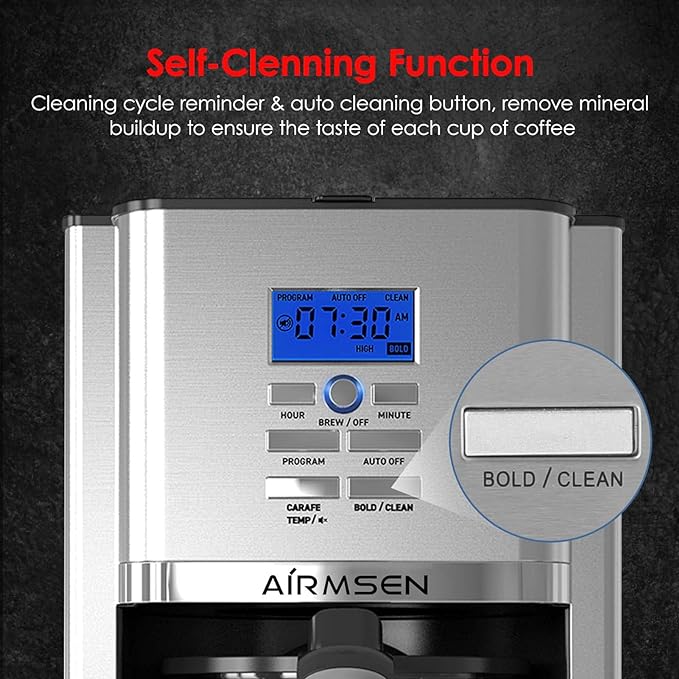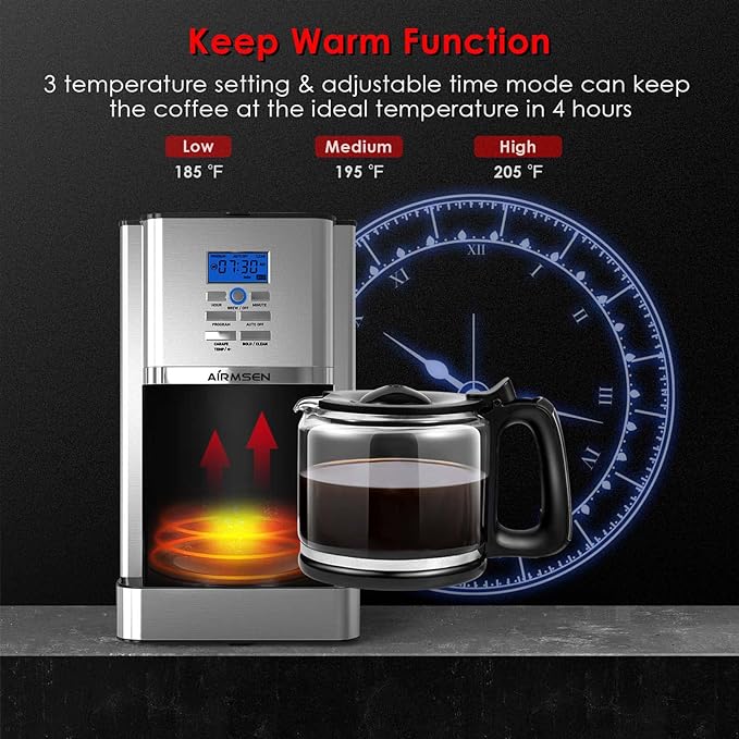 - Programmable Coffee Maker – AIRMSEN coffee maker comes with a programming feature that allows you to set the brew time 24 hours in advance, so that when you wake up in the morning, AIRMSEN electric drip coffee maker is already ready for you, saving you time in the morning. Plus you can use the adjustable heating plate (three temperature levels) to keep your coffee fresh and flavorful for up to 4 hours.