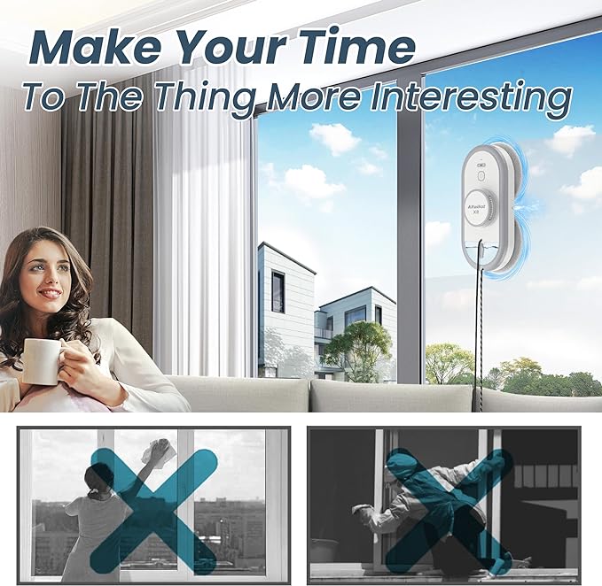 - SELF-ADJUSTABLE SUCTION – This window cleaning robot will automatically varies suction from 2600-2800Pa to climb up and remove different stains.
