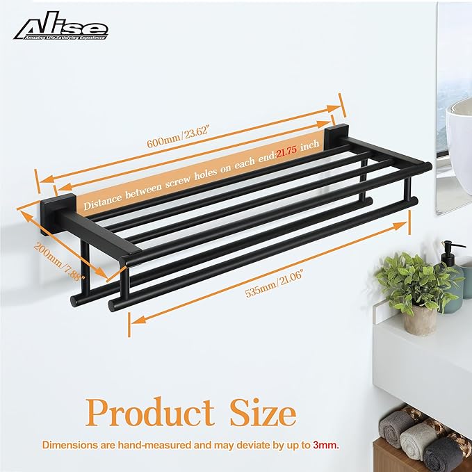 - 【Large and Practical Design】 Unique towel shelf with double towel bars design makes the overall line smooth and beautiful, and ensures a larger storage space for towels, so that your towels can be stored neatly on it. Note: The length of the towel rack is 23.6 inches, the towel bar hanging length is 21.2 inches, and the distance between the left and right mounting holes is 21.75 inches, please pay attention to measure the mounting distance to make sure it is suitable.