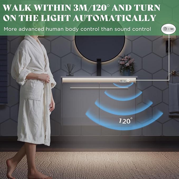 - 【Smart Human Body Sensor Light】Bathroom floor cabinet intelligent module can automatically turn on when you are 10ft/120° away from this bathroom furniture, and turn off after 22s without human activity.