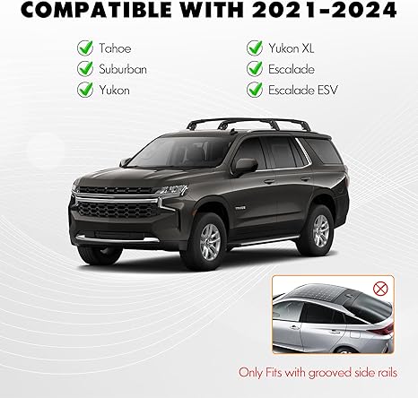 - Compatibility: Our roof rack Compatible with 2021 2022 2023 2024 Tahoe & Suburban/ GMC Yukon & Yukon XL/ Cadillac Escalade & Escalade ESV with side rails (flush rails),Please check your vehicle’s Year, Make and Model before purchase