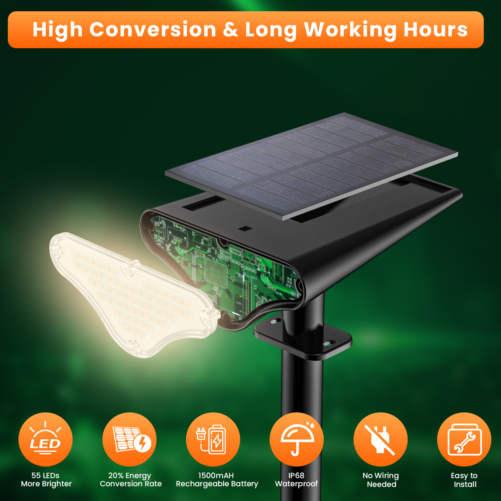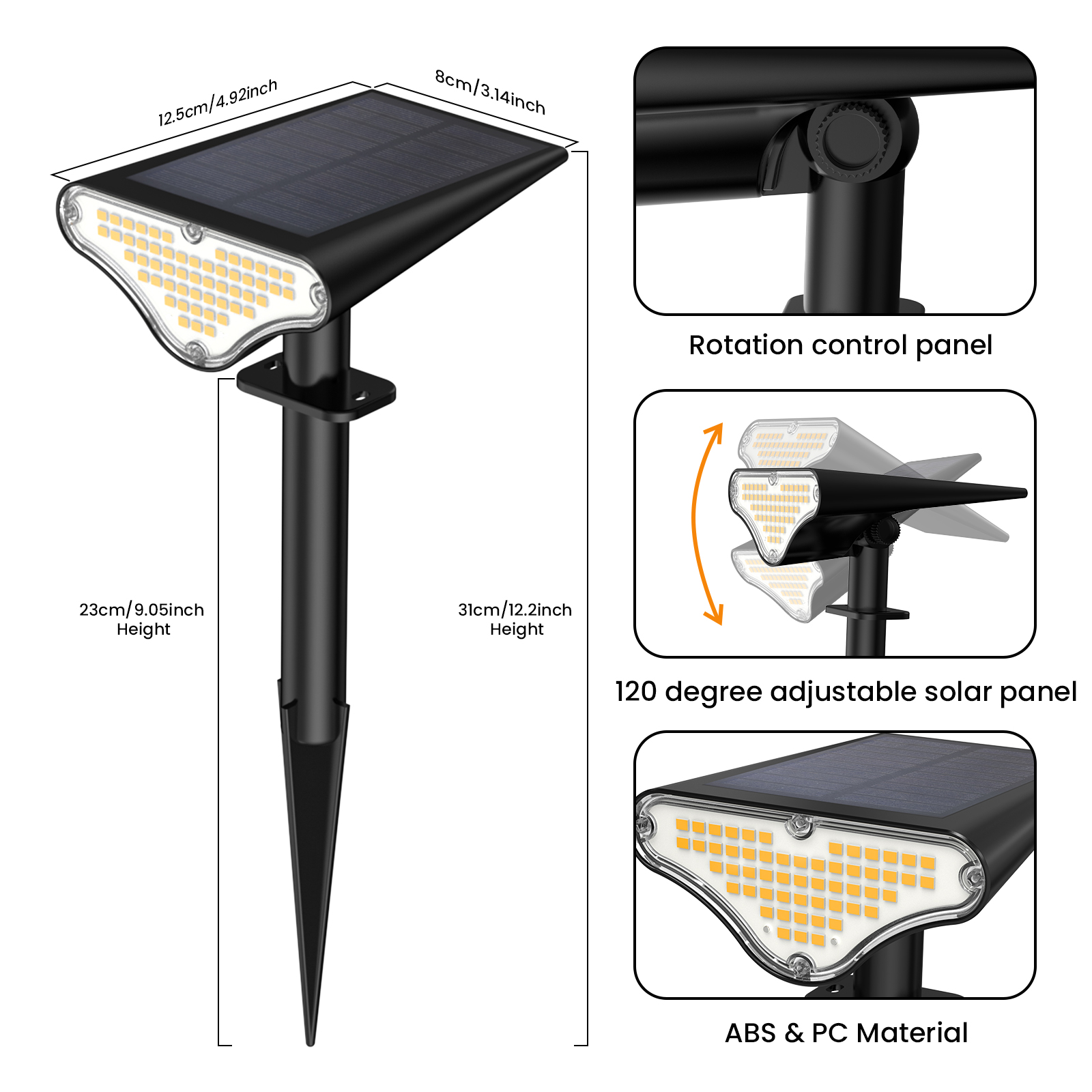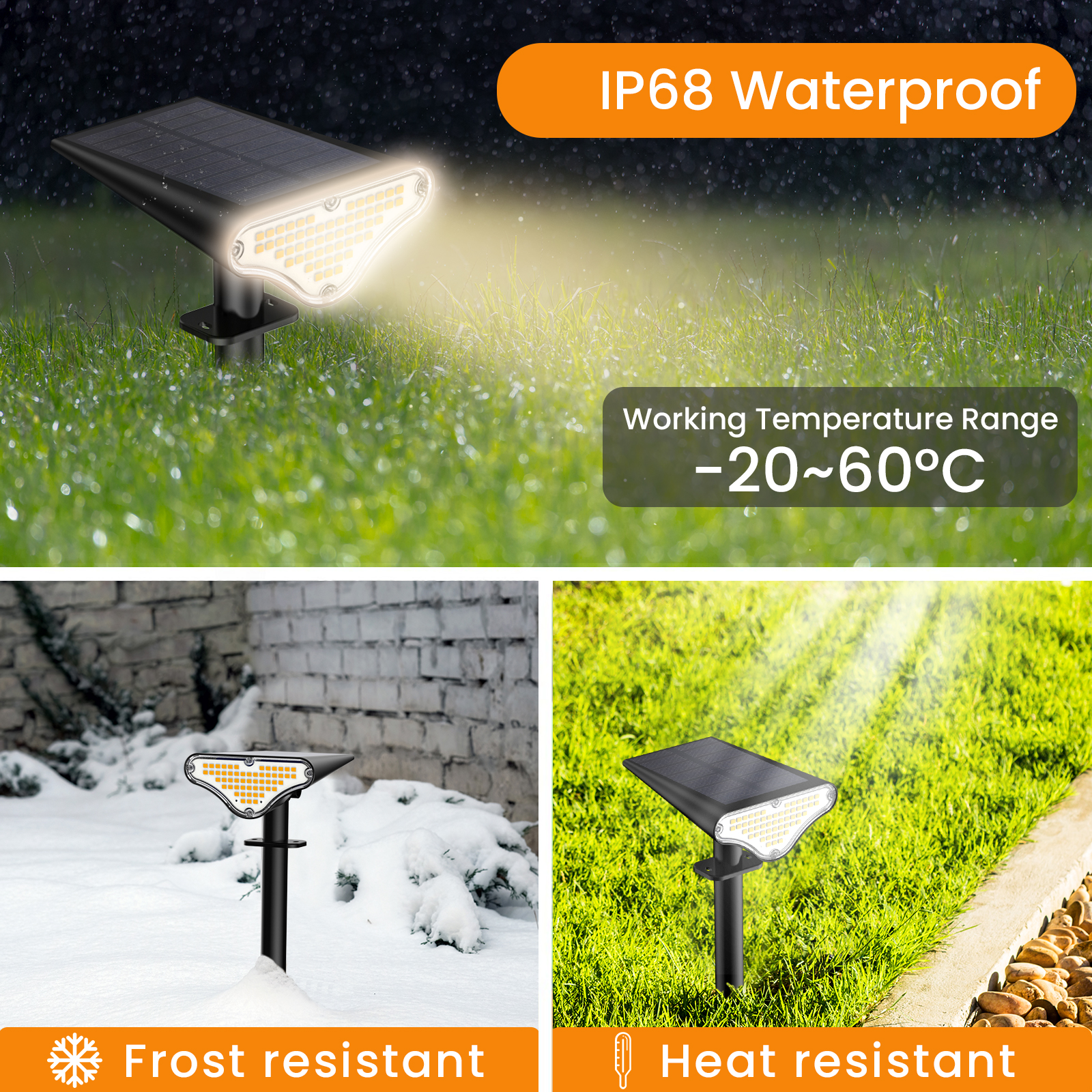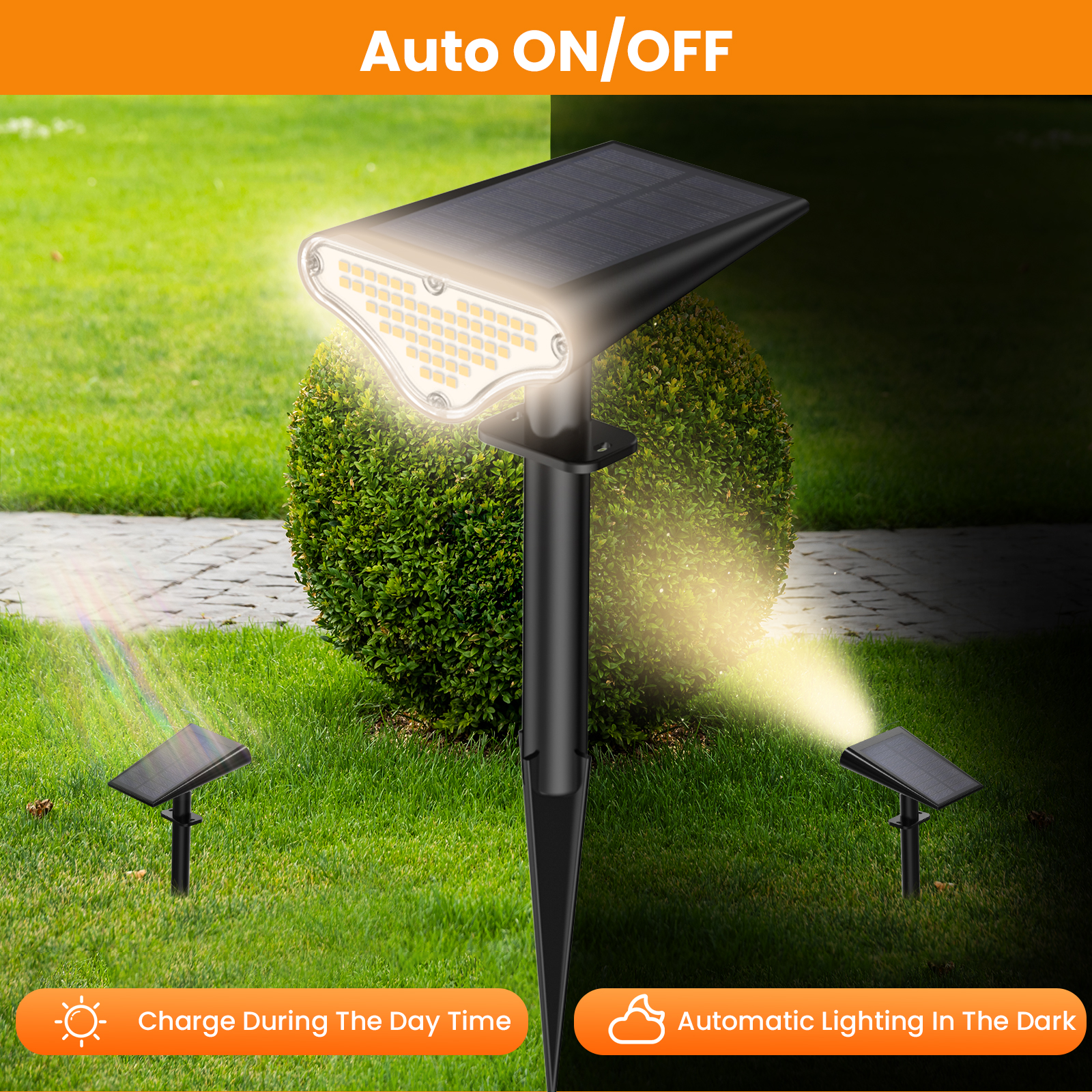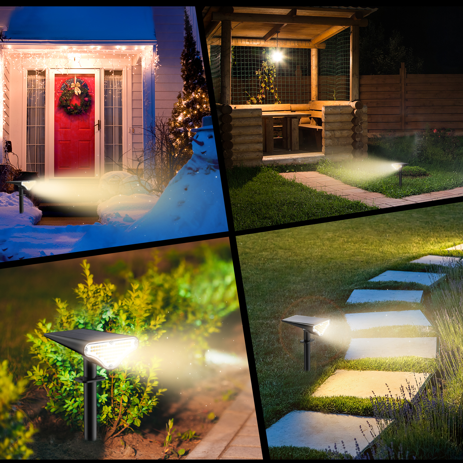 • High Efficiency and Widely Applicable: The solar energy conversion rate of up to 30% means that the solar spotlights charge quickly and efficiently. Solar landscape lights can be used in a variety of outdoor settings, including gardens, porches, fences, pools, and walkways.