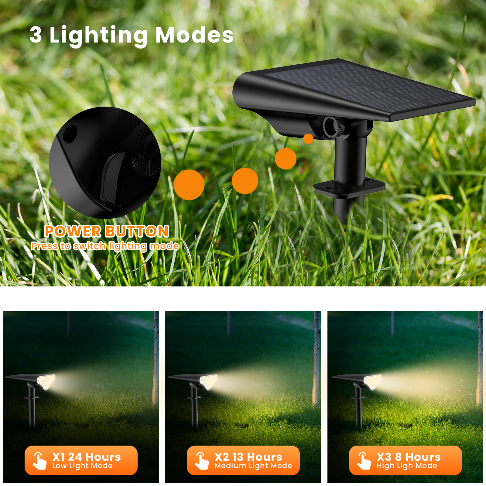 • Three Brightness Modes: With three different lighting modes, these solar powered outdoor lights can cater to different lighting needs, providing up to 24-13-8 hours of continuous use.