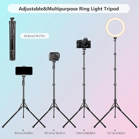 - Height & Angle Adjustable: The extendable tripod features 4 sections with 3 locks, allowing height adjustments from 16 to 62 inches. The rotatable head enables the ring light to be positioned either perpendicular or parallel to the tripod, making it ideal for video recording, live streaming, and more.