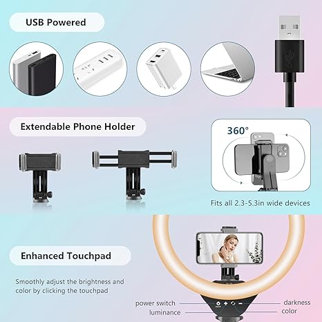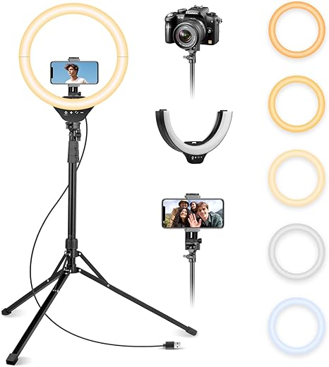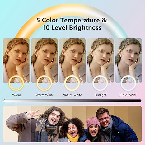 - User-Friendly Touch Control: This LED ring light offers 5 color modes (Warm, Warm White, Natural White, Sunlight, Cold White) and 10 brightness levels (10%-100%) to suit various needs. The touch-sensitive control pad ensures easy adjustments and a longer lifespan compared to traditional buttons.