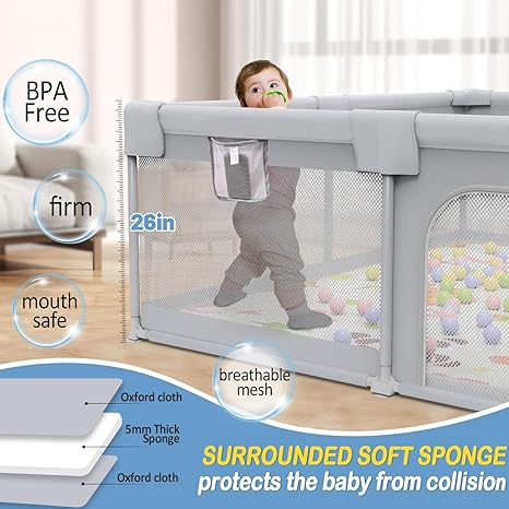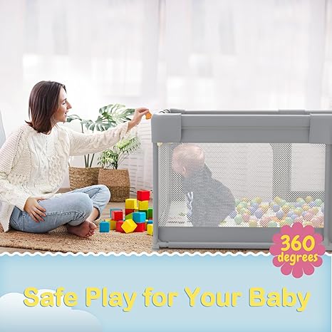 - ✔360° See-through Design: allows you to keep an eye on your little one while providing them with the freedom to play and explore. The playpen is wrapped in 0.6 inch cotton-padded padding, which cushions any falls and ensures your baby stays happy and comfortable.