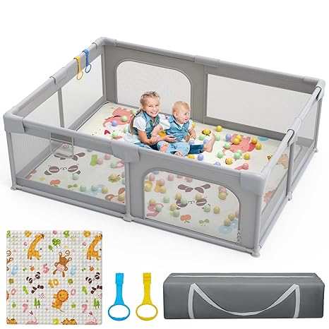 - ✔Baby gyms & playmats, Baby Care Set: In addition to the playpen, you’ll also receive a play mat for children and two baby exercise hooks, which saves you money. You can use the playpen as a toy storage place or a ball pit for entertainment.