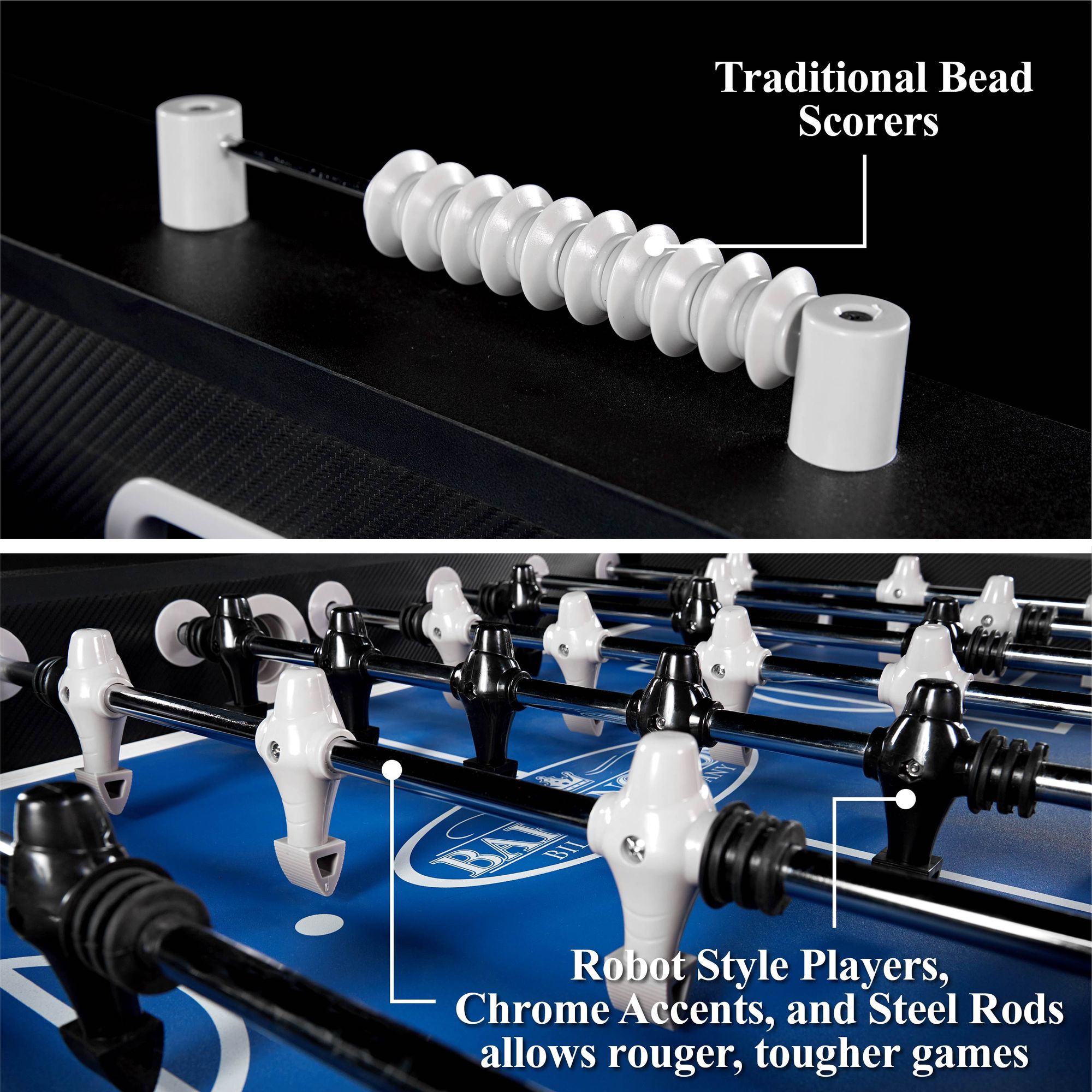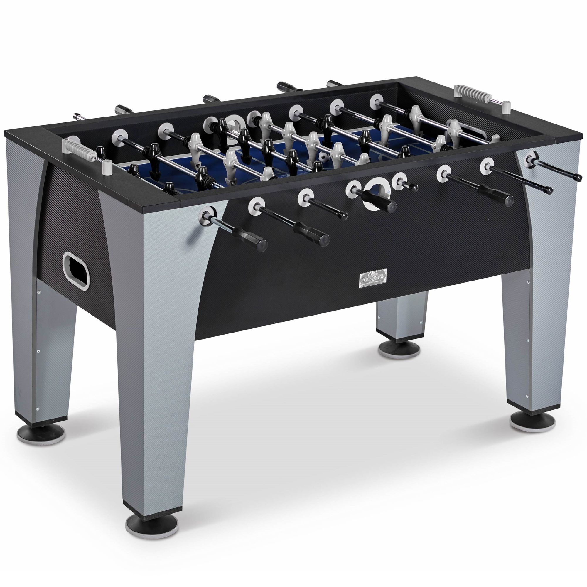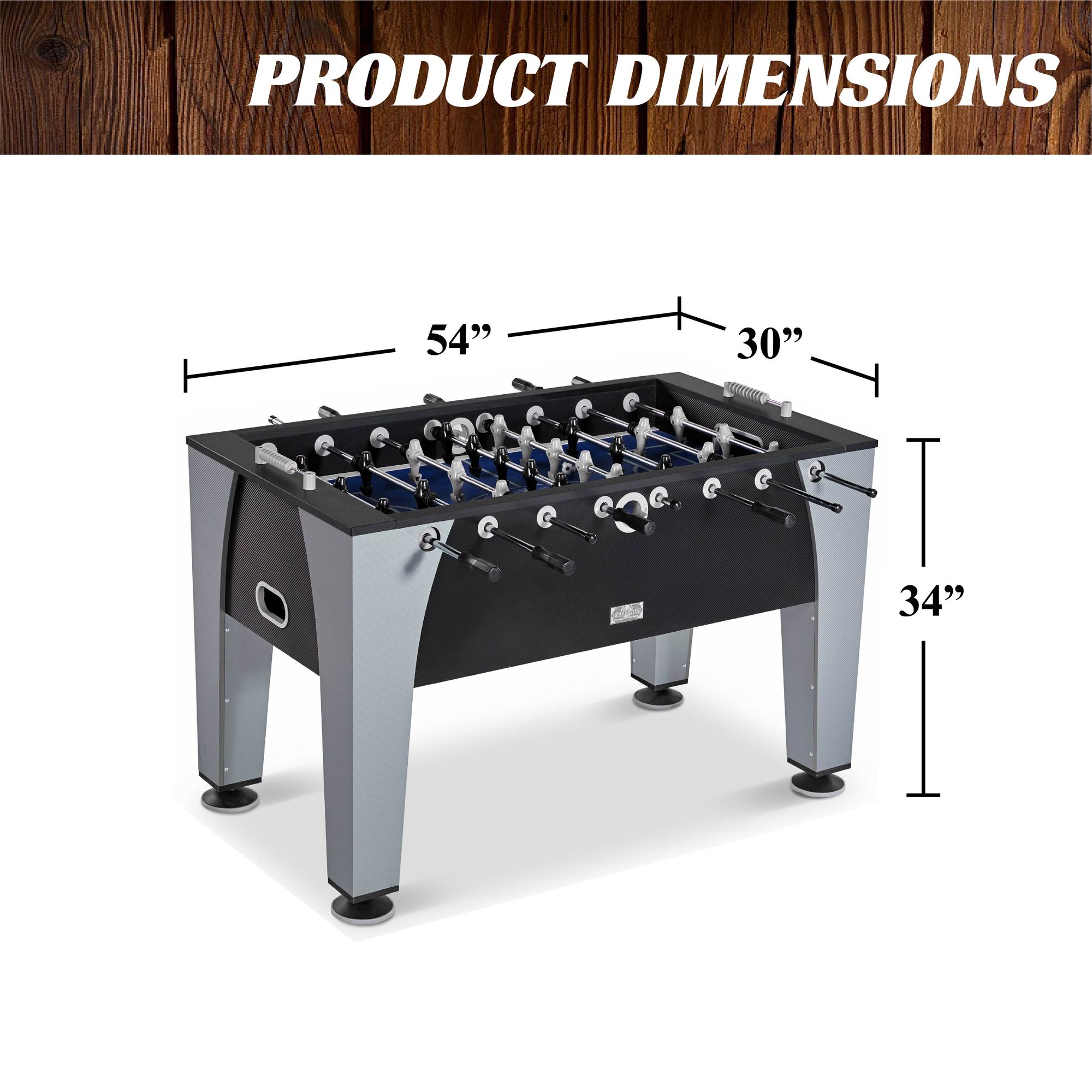 ARCADE FOOSBALL Bring arcade-style fun back home with the Barrington 54 Inch soccer Table. Set up for one-on-one or multiplayer competition and invite the neighborhood over. Each set comes complete with everything you need for quick assembly and play. ROBOT STYLE PLAYERS Add modern style to your gaming with this foosball table that features cool robot style players, classic scoring, chrome accents, and steel rods so you can play rougher, tougher games. STURDY CONSTRUCTION The regulation playing field is made of high-quality medium density fiberboard, with square legs, reinforced top rail, and oversized 5 inch leg levelers for increased durability and stability. This means more intense action and rougher play game after game. PERFECT FOR KIDS, ADULTS We design our sports equipment for all players to enjoy. Whether you’re just starting to learn how to play foosball or already seasoned player, anyone can join in the fun and competition. Roll out the arcade for birthday parties, graduations, get-togethers, holidays, or simply whenever you want.