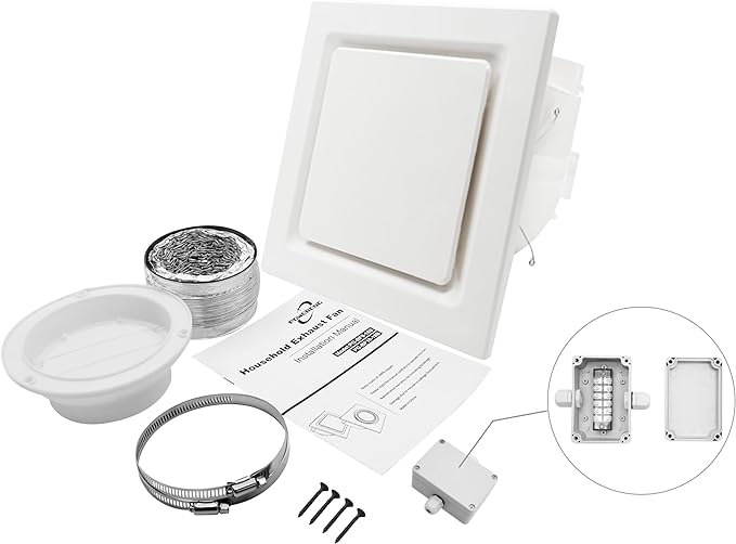 • Exhaust Fan: 0.7 Sones,141 CFM 110V 45W. This exhaust fan operates at 0.7 sones and an airflow rate of 141 CFM, making it ideal for spaces up to 141 square feet. It operates very quietly, so you can enjoy a peaceful environment in your space.