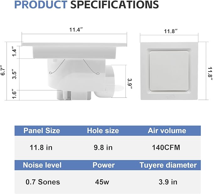 • Easy to Install: 11.8 x 11.8 inches(L x W), Mounting Hole Size: 10.8 x 10.8 inches(L x W), Duct Diameter: Ø4.0 inches.Please confirm the size before making a purchase. The product can be easily fixed to the ceiling with screws, providing a sturdy installation.