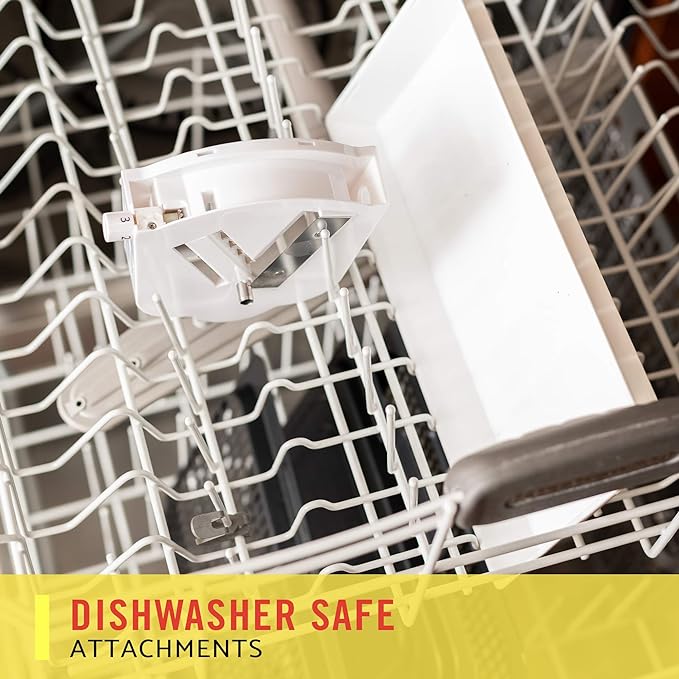 - EASY TO CLEAN & MAINTAIN: This sturdy unit easily separates with dishwasher safe removeable parts so you can thoroughly clean the spiralizer. It includes a hard bristle cleaning brush so your hands stay clear of the sharp cutting mechanism.