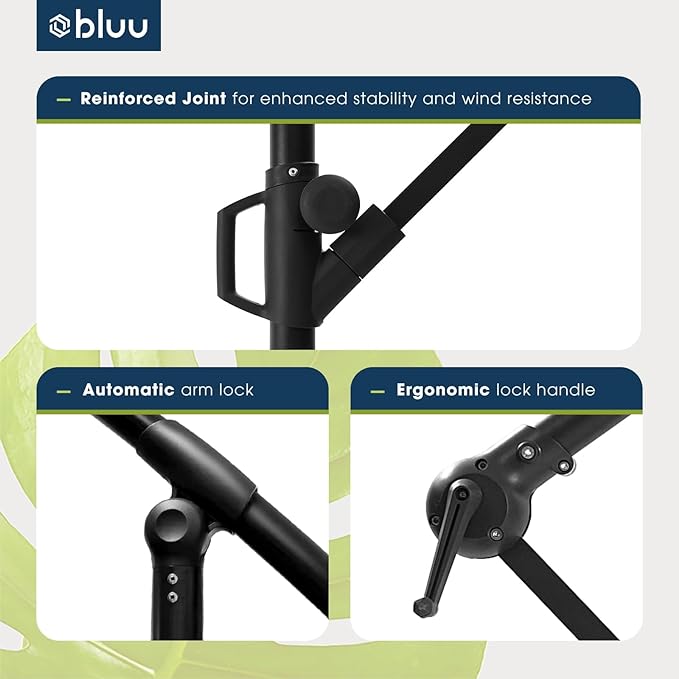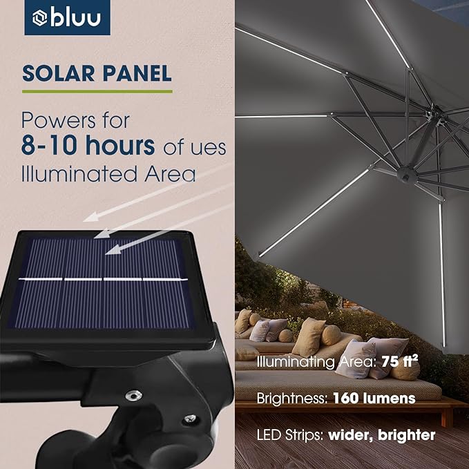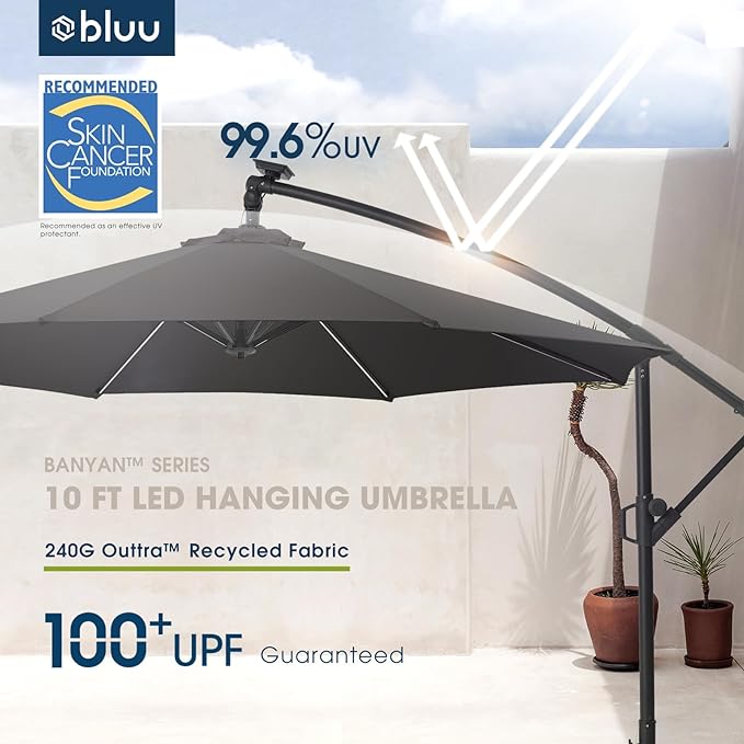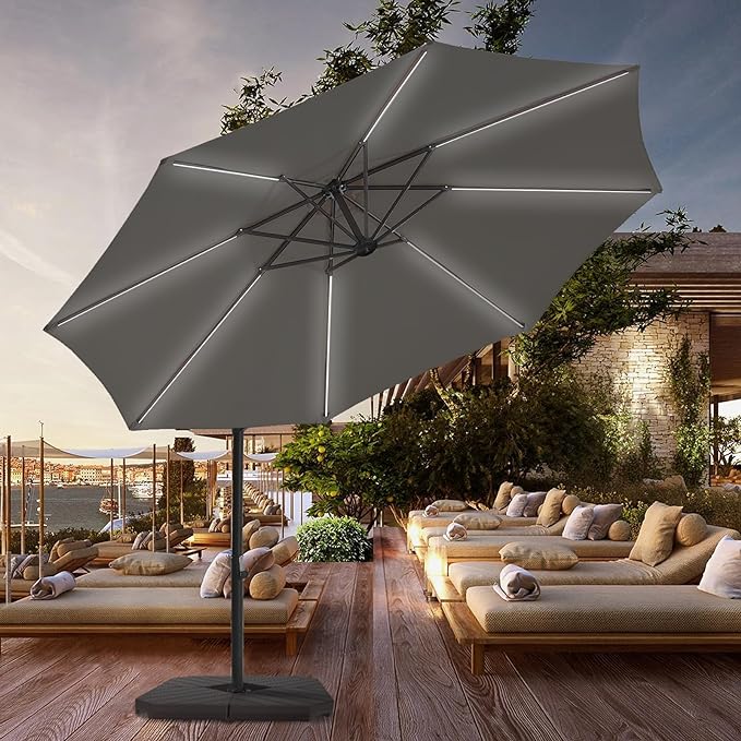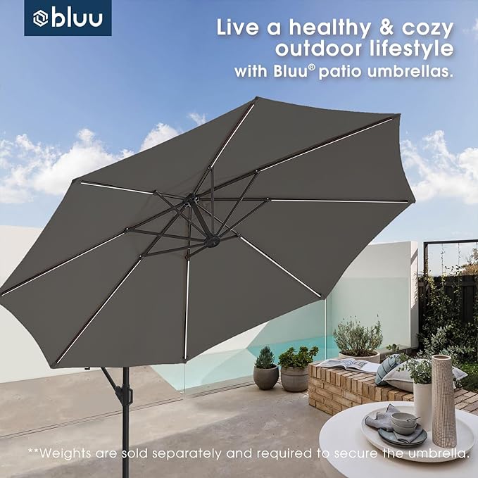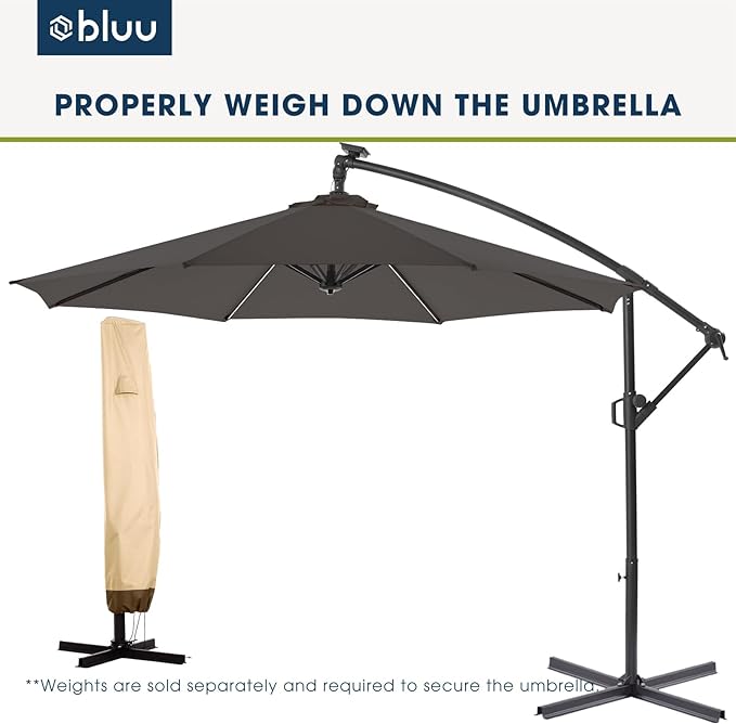 BLUU 10 FT Patio Offset Umbrella Outdoor Cantilever Umbrella Hanging Umbrellas, Fade Resistant Crank & Cross Base (Grey, 10 FT WITH LIGHTS) “PLEASE SEE DESCRIPTION”