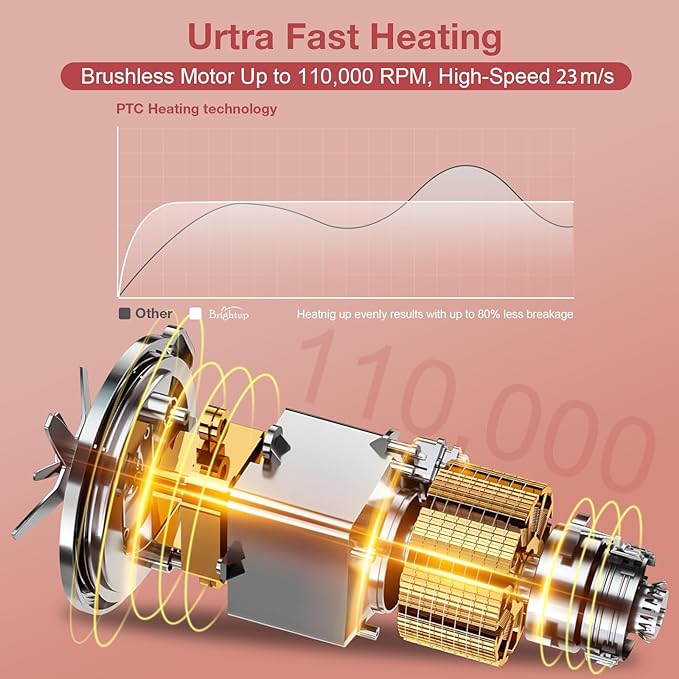 - [110000 RPM High-Speed Hair Dryer] This high-speed motor up to 110,000 RPM, generates high-velocity and powerful airflow up to 23m/s, 6 times the airflow powerful than an ordinary styling tool, which allows the hair dryer to dry ultra-fast while maintaining low heat, ensuring fewer frizz, and keeping your hair smooth and shiny. Reduce your styling time in half for ultra-fast drying with no heat damage—innovation for a remarkable styling experience.