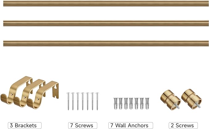 - 【Package Include】The curtain rods incould 2 telescopic rods, 2 finials, 3 brackets, 7 screws, 7 anchors and 1 installation guide.