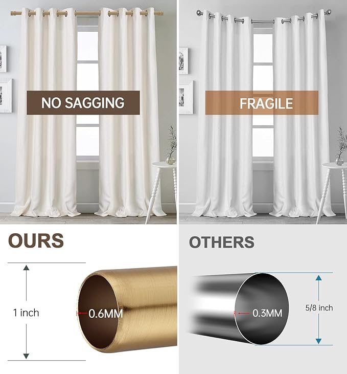 - 【No Sagging & Non-Deforming 】Sturdy and durable,1\” diameter and 0.8mm thick metal curtain rod,weight capacity up to 30 pounds.Use the rod for anything from sheer flowing curtains to heavier insulating drapes.