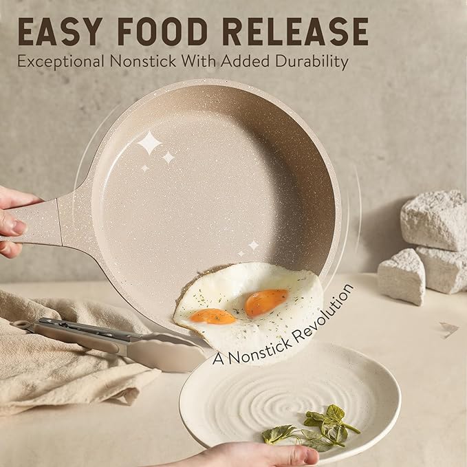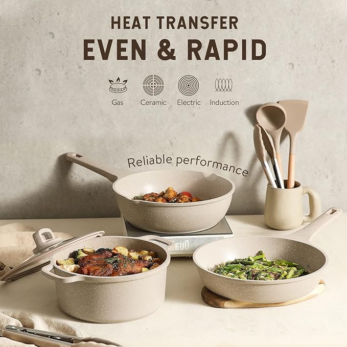 - Effortless Nonstick Cooking: Easy food release with silky smooth nonstick performance after every meal. Induction-ready: Heavy-gauge base makes this kitchen pots and pans set safe for all stovetops and sturdy enough for use.