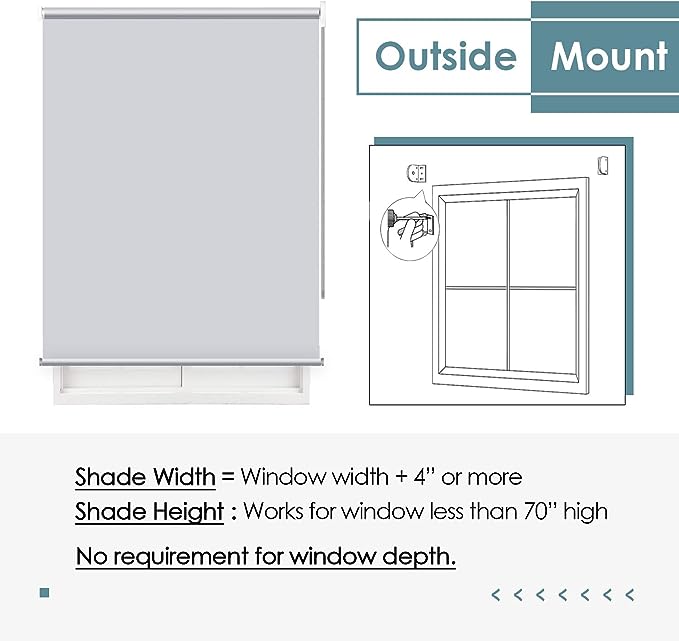 - MEASUREMENT: The fabric width is 1” narrower than the total roller width, due to the brackets at the both ends. For inside mount, window frame should have at least 2” depth, and blackout roller shades will have a tiny light gap on each side. To avoid light gap, consider the outside mount. For outside mount, shade should be 4” – 6” wider than window frame, shade length should be at least 2” longer than the window length for better coverage.