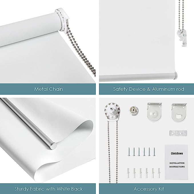 ChrisDowa 100% Blackout Roller Shade. Total Blackout Roller Blind for Office and Home. Easy to Install. White