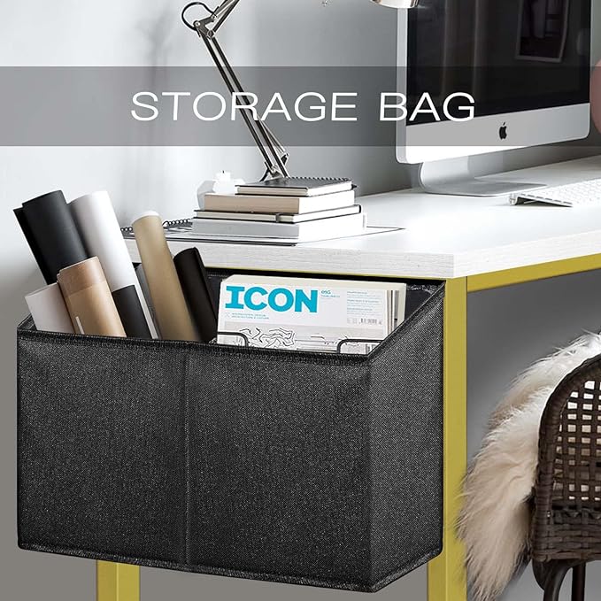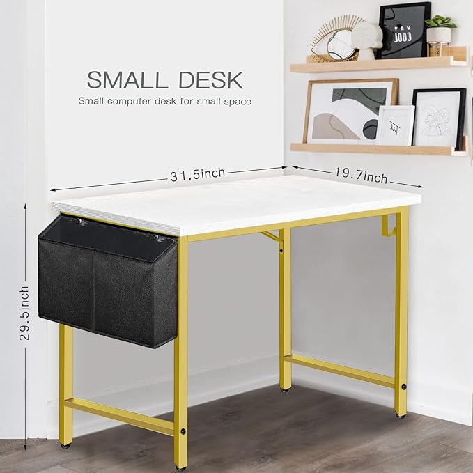 • Modern Simple Style Design: This compact desk is made of thick Particle board with scratch-resistant, anti-collision and waterproof design, which protect the home office desk surface from daily wear and tear, White desktop match gold metal frame ,with storage bag and Headphone hook .