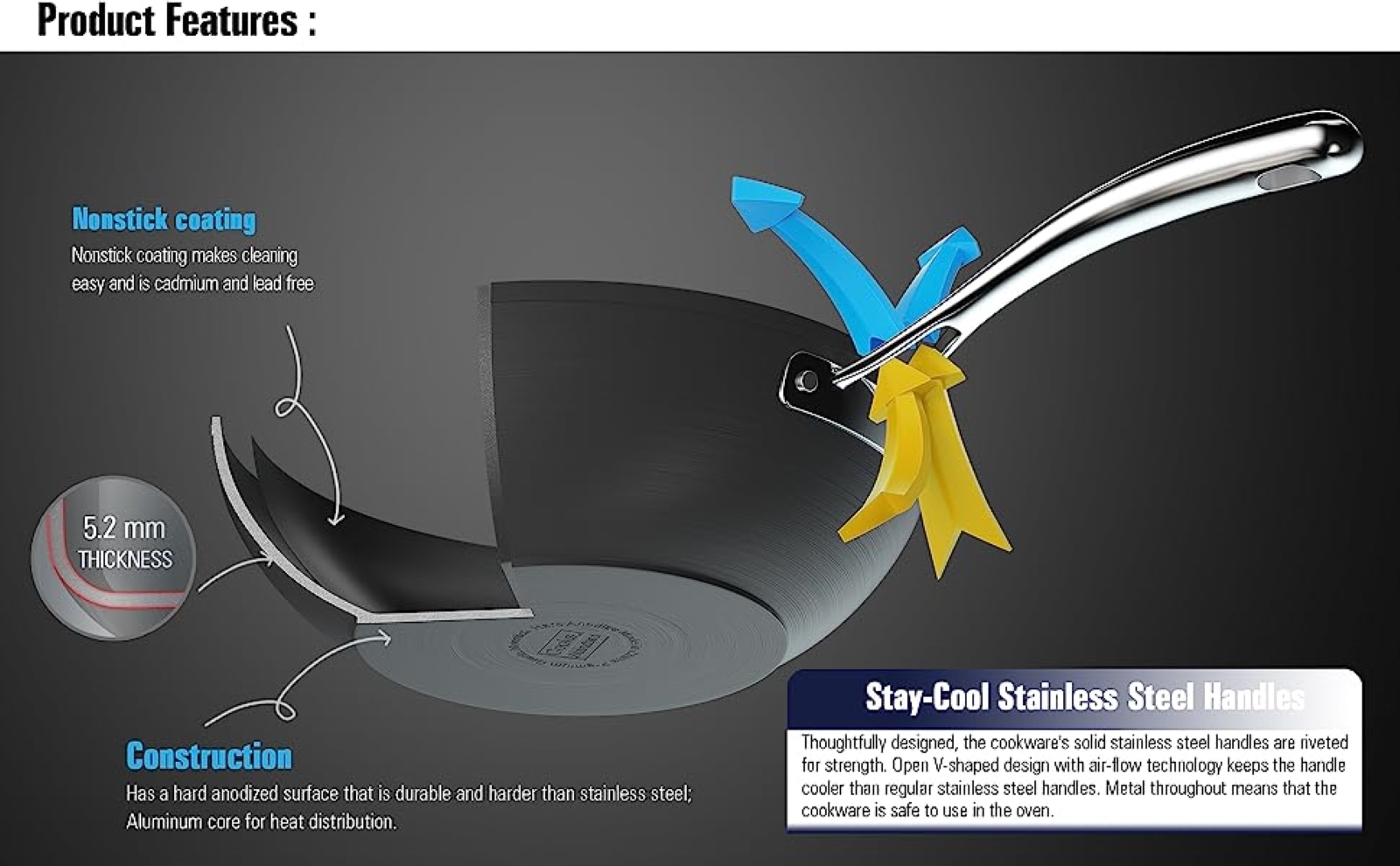 • 【Non-stick Performance】Nonstick performance for easy food release and tossing,  cleaning, just need to cook with little oil; and allows for healthy cooking by using various traditional cooking techniques like pan-frying, braising, and deep-frying.