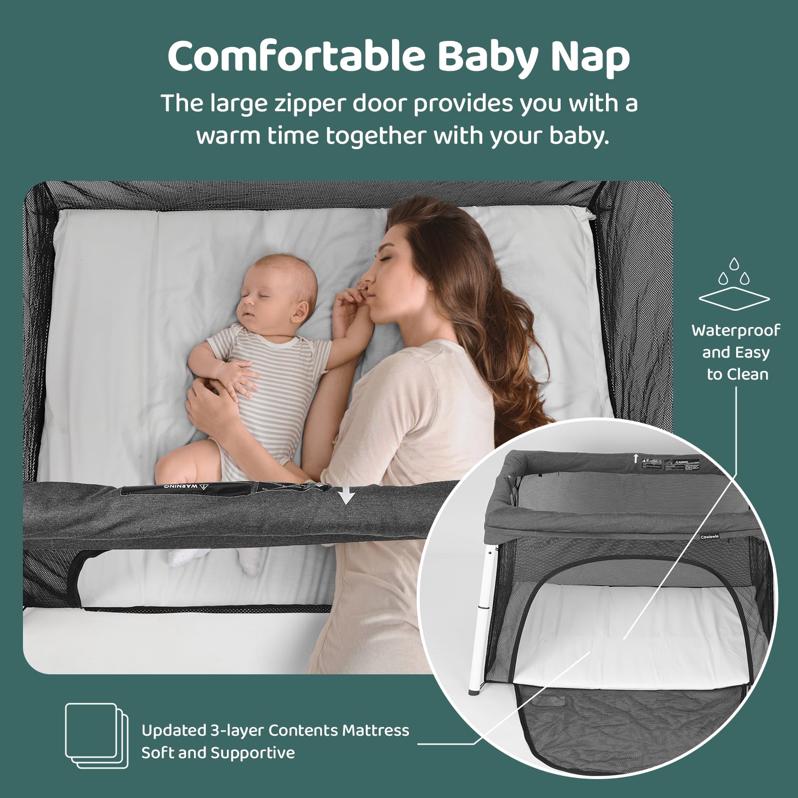 - 【BUILD A BETTER BOND】Quietly and easily unzip the lockable side door to help your baby fall asleep or turn the portable crib into a play yard. With the door open, you can nurse or cuddle your little one to help them feel safe and secure in a new place and foster an even stronger connection. The updated waterproof mattress has a thick, soft foam approved for overnight sleep (ages 0-3) making it a safe and comfortable environment for both resting and playing.