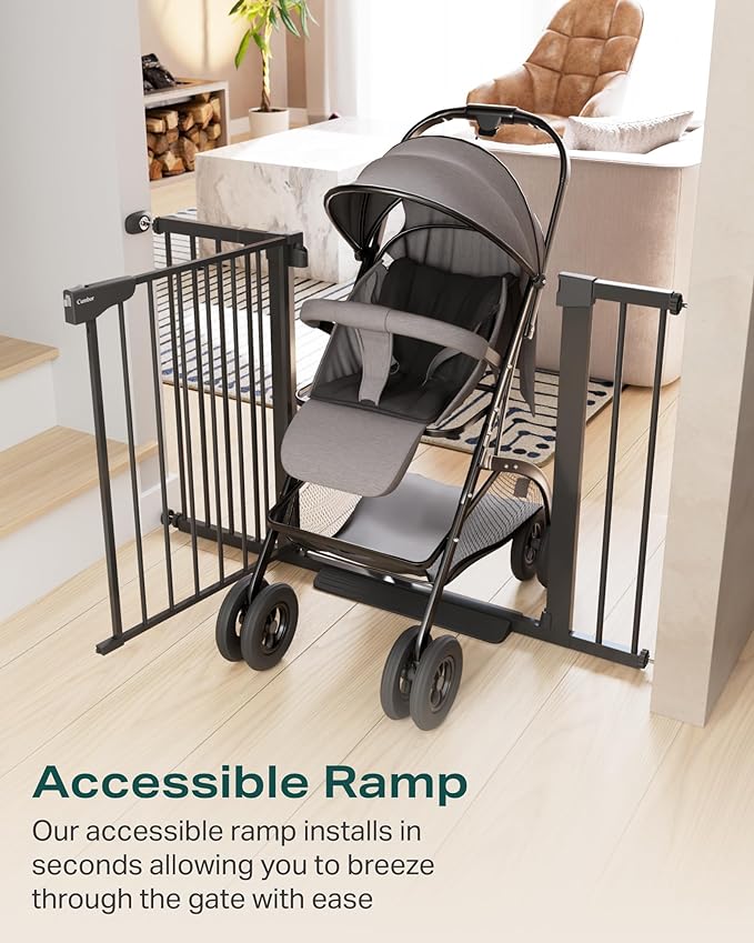 - 【No More Baby Escapes】The Cumbor extra-wide baby gate is 30.5 inches tall and 29.7 inches to 51.5 inches wide. Once closed, it is hard for your kids to climb over it. Made of heavy-duty steel, it can withstand impacts and bites from large pets. Additionally, this gate prevents kids and pets from squeezing through because the measurement between the bars is only 2.3 inches.