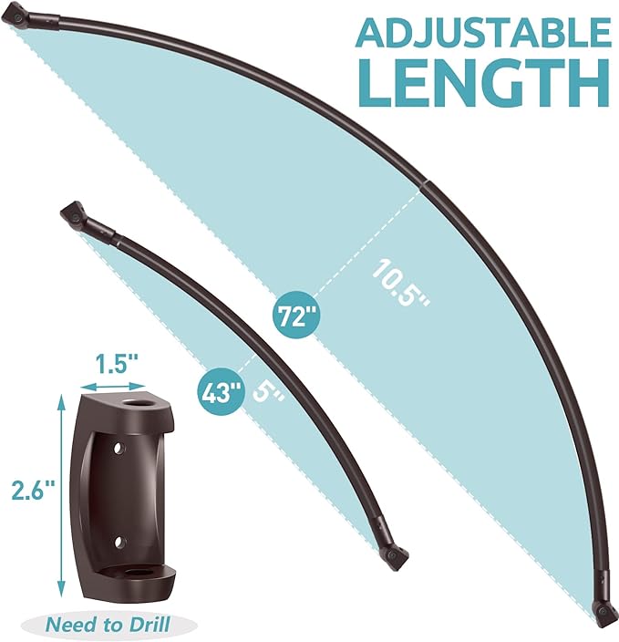 - 【Adjustable 43-72 Inches】 Curved shower curtain rod adjusts between 43 to 72 inches. Telescoping design expand and adjust to your specific bathroom layout. The base can be rotated to any angle, installed without angle limitation, is the ideal solution for bathroom of a variety of sizes.